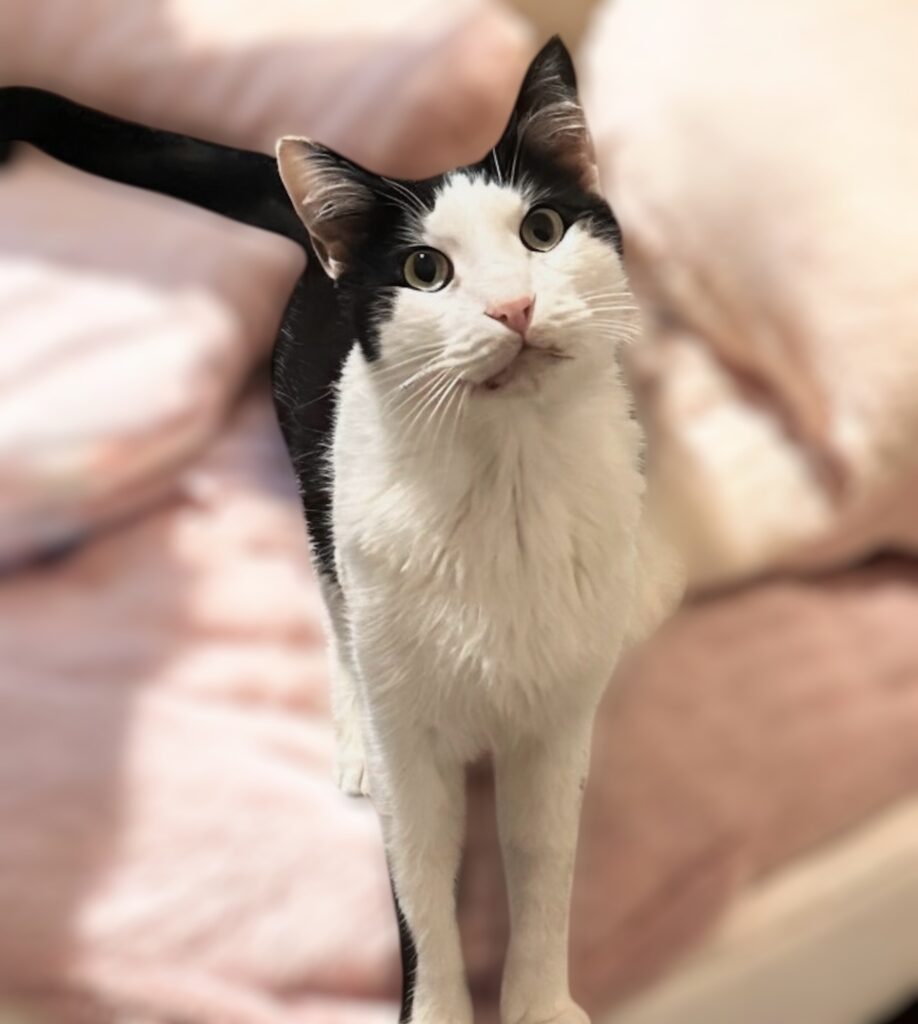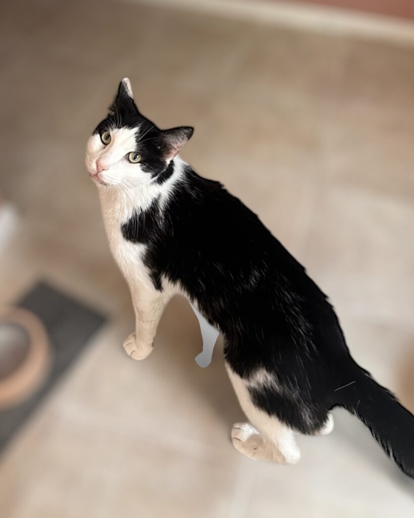 After receiving much-needed dental care (he’s now missing most of his teeth), Chili began to truly blossom. With steady meals, comfort, and care, he’s been gaining weight and showing us who he really is: a sweet, affectionate soul who greets each day – and each person – with quiet gentleness.