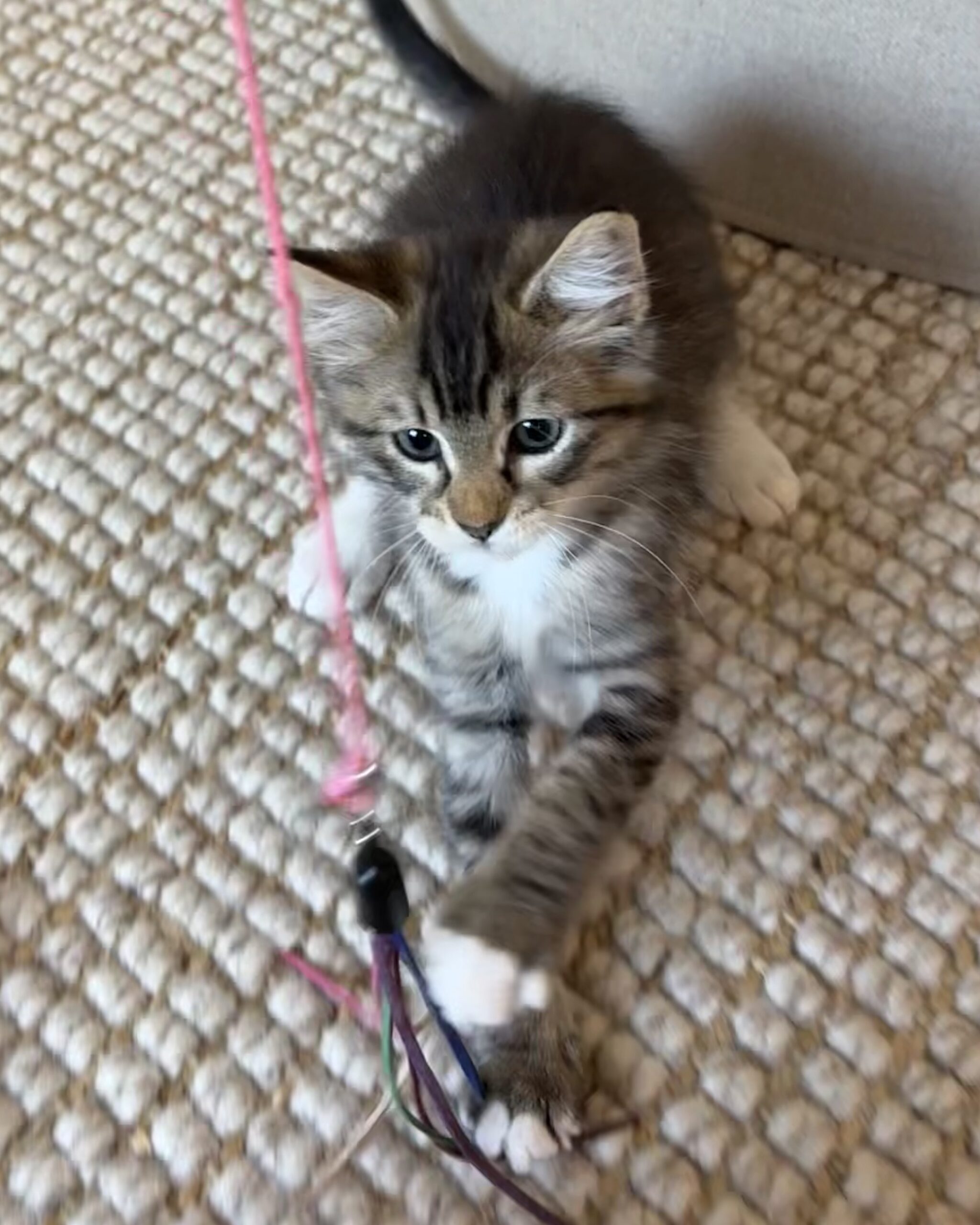 Pickle has never met a lap she didn’t love. She’ll follow you around like a shadow, always curious and ready to join in whatever you’re doing. She’s playful, gentle, and full of charm – the perfect mix of kitten energy and calm companionship. She would do excellently in a busy home and does great with kids.