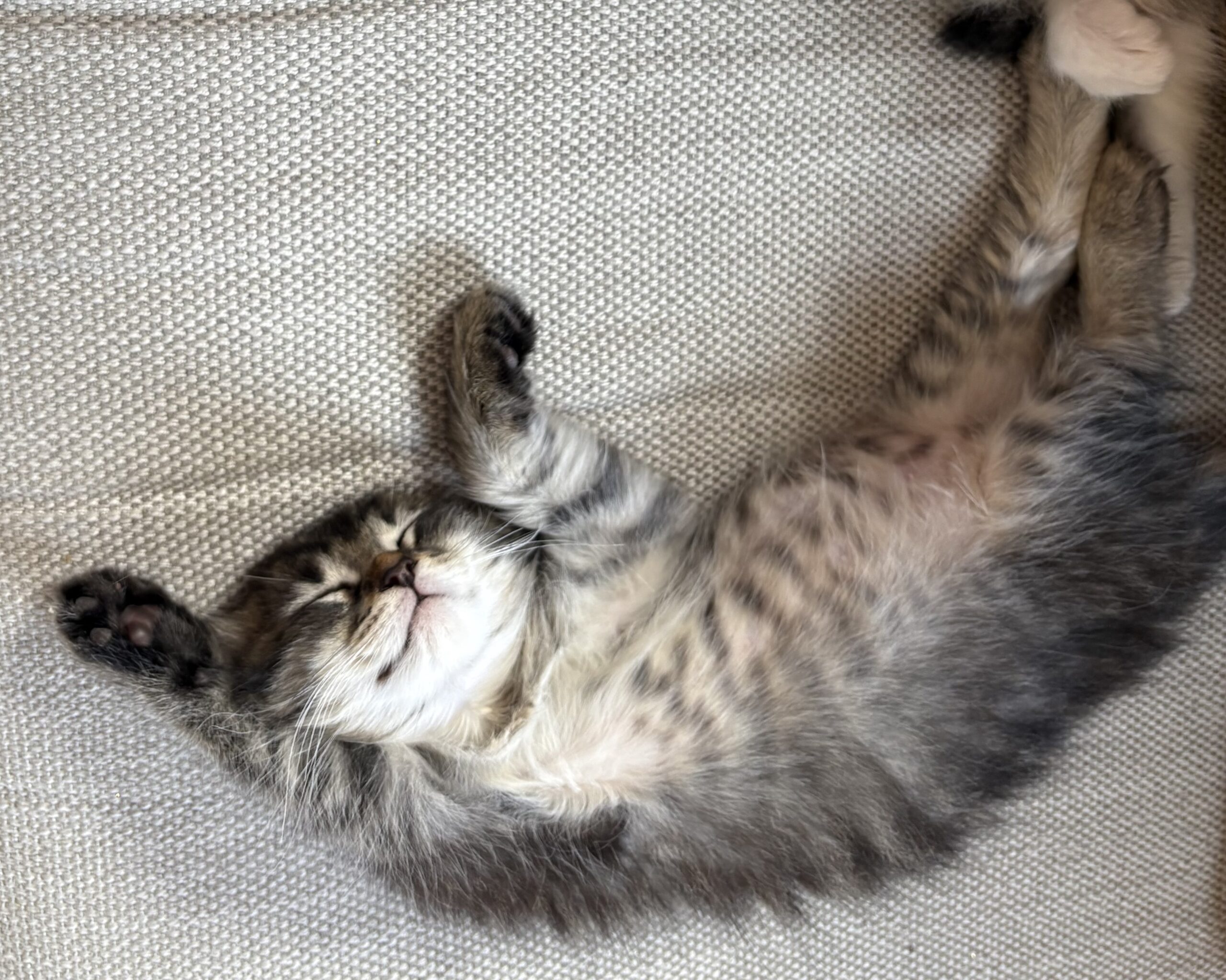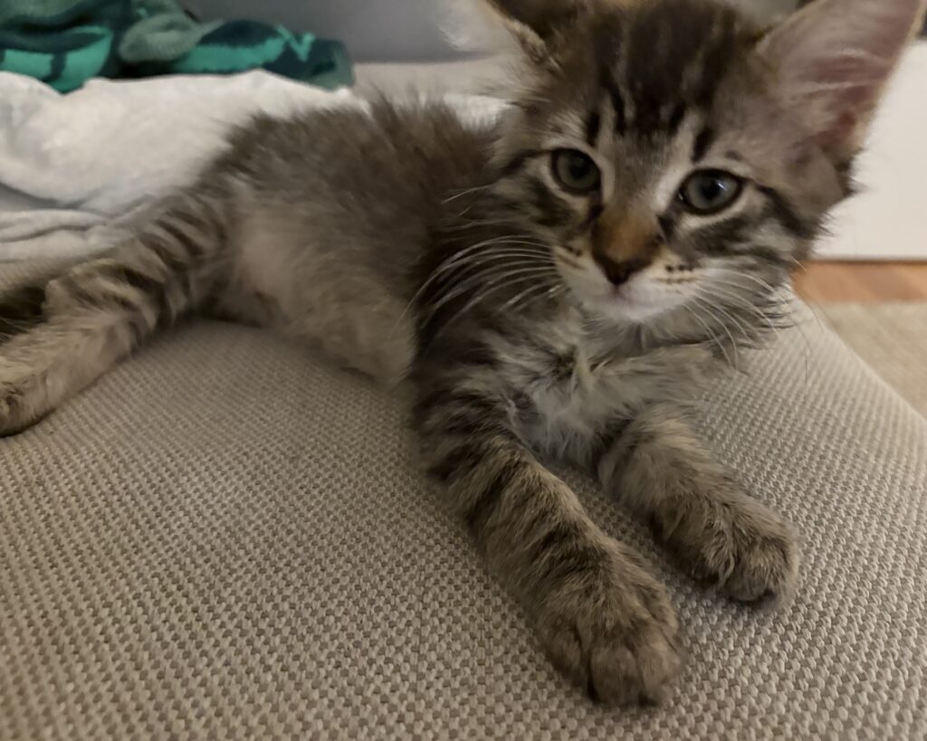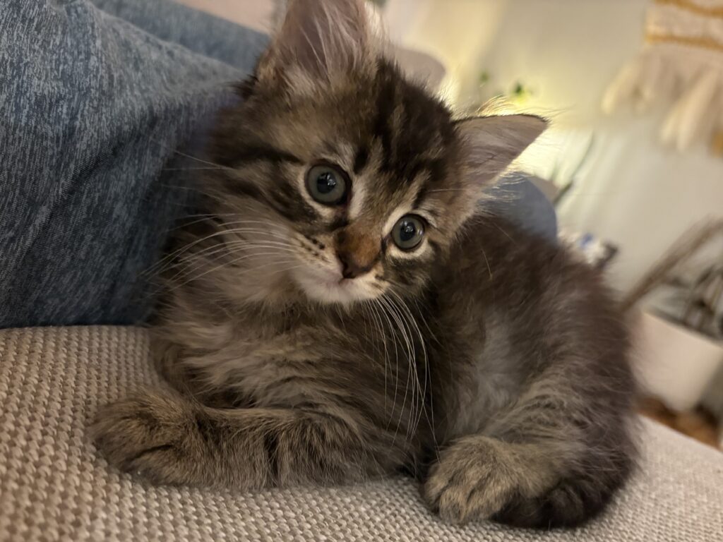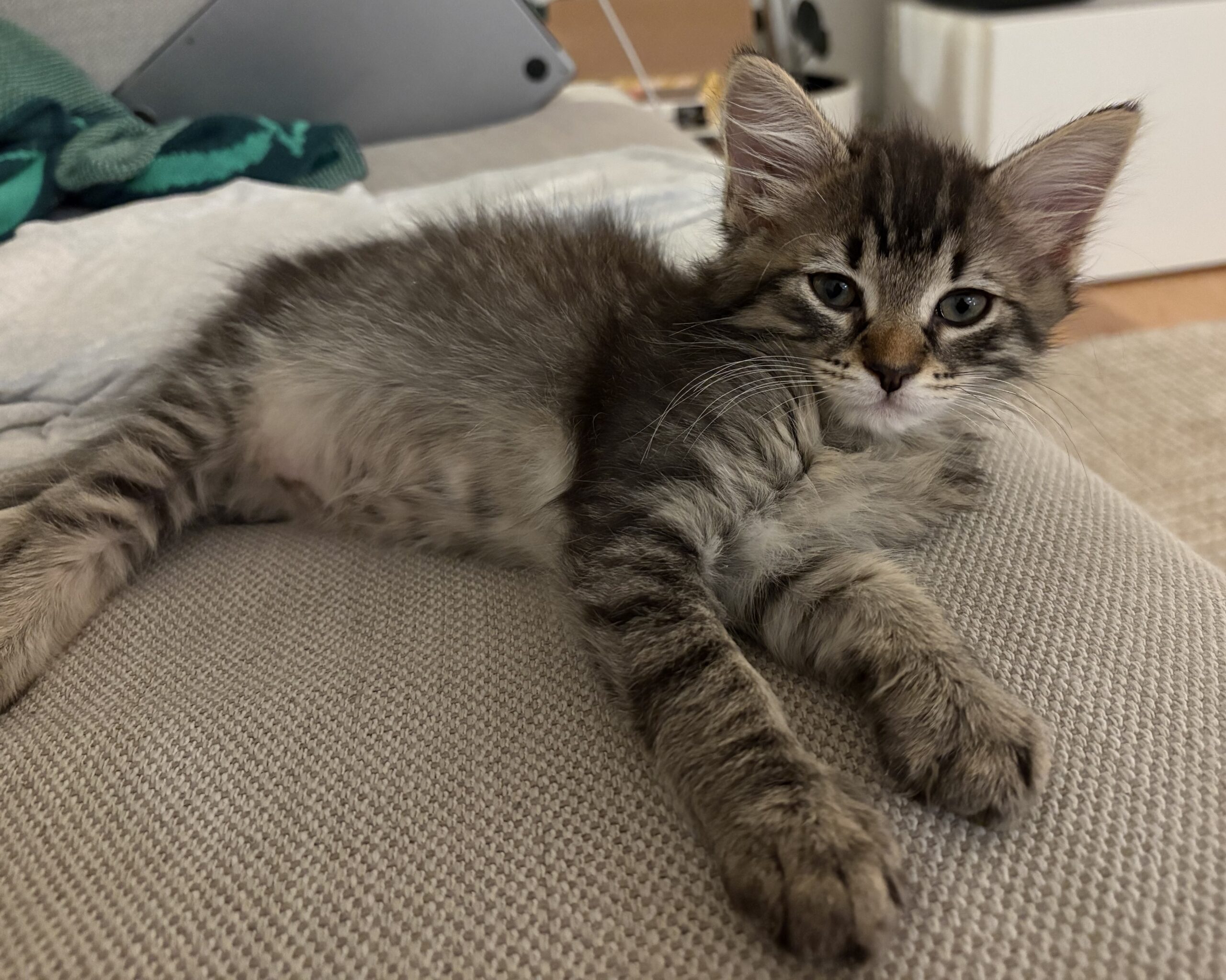 Say hello to Pepper, a curious and clever little brown tabby with a big personality! Always alert and usually nearby, Pepper is your very own tiny manager, supervising your every move with wide eyes and adorable intensity. Whether you’re working, cleaning, cooking, or just relaxing, Pepper is right there making sure you’re doing it just right (and maybe sneaking in a head boop or two).