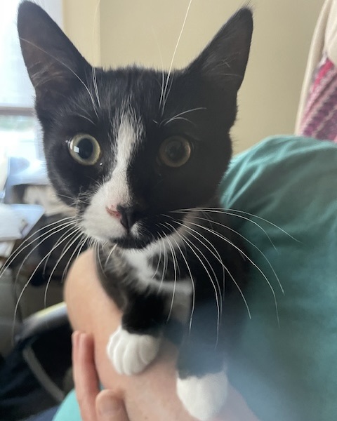 Thunder is a handsome, gentle tuxedo boy. He wants to be right by your side to assist you in any activity. He is curious, goofy, friendly and confident. With his pink and black nose and perfect white whisker, Thunder makes the perfect companion. They don’t call him Thunder for nothing! One tap on the back, and his motor starts running. and his purr is super loud.