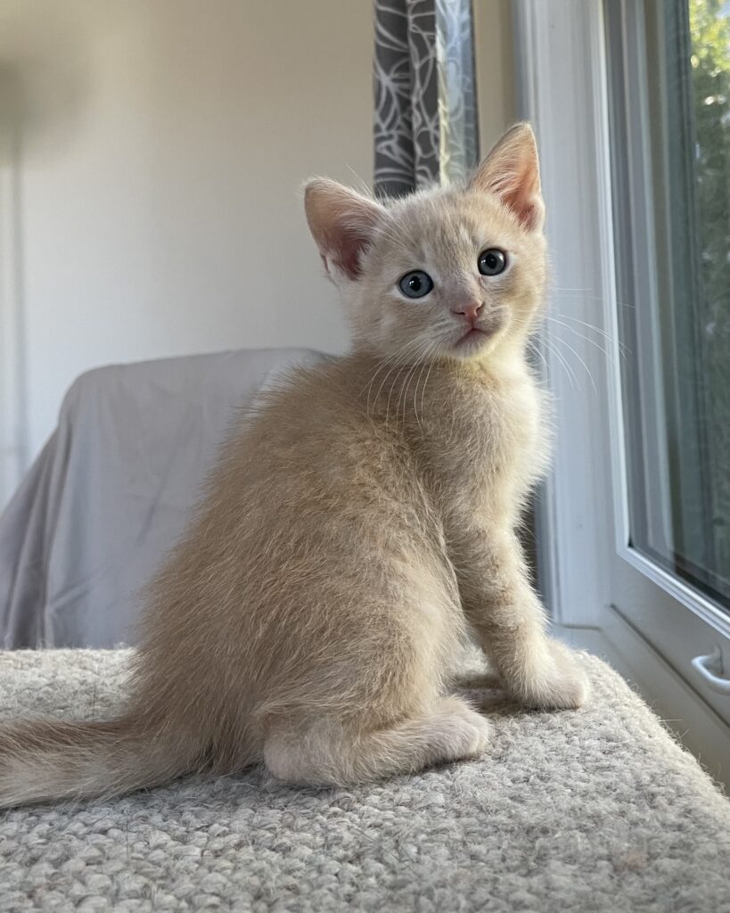 Zeus is a beautiful pale orange like his brother Hermes. He’s brave and adventurous, and will come right up to strangers. He enjoys his playtime but afterwards will come up to rest in your lap, purring as you pet him. This Zeus won’t hurl thunderbolts, but he’ll find a way into your heart.