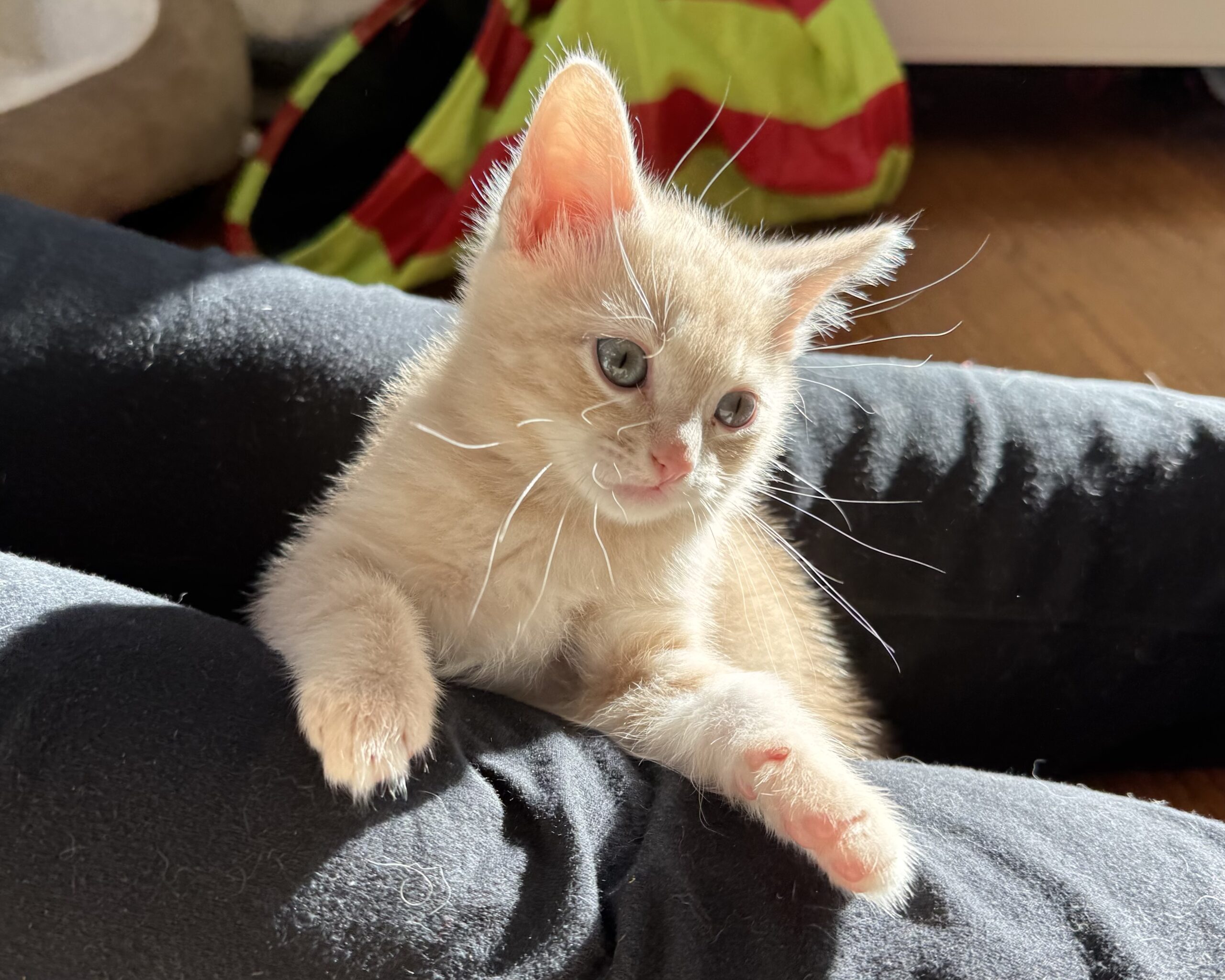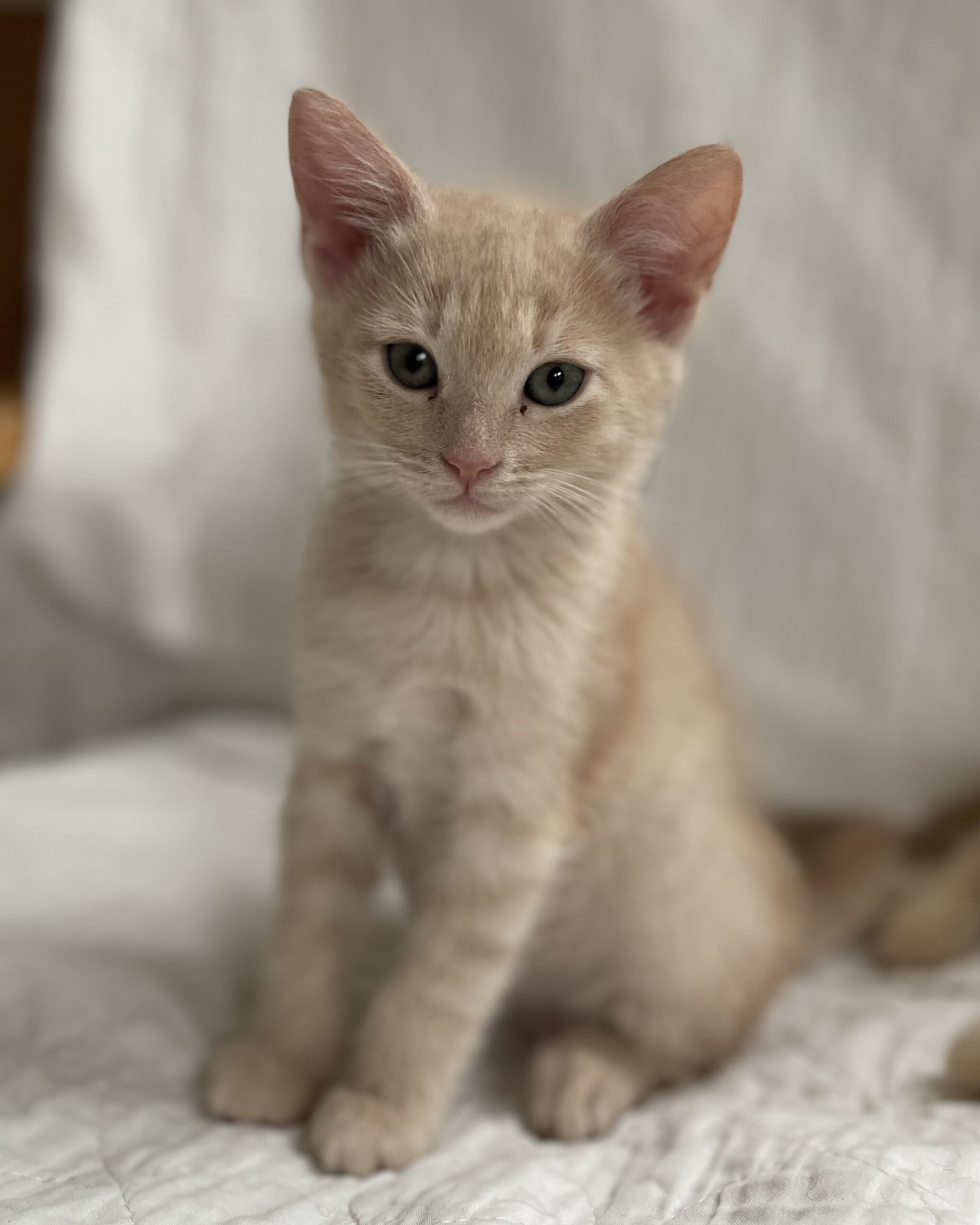 Zeus is a beautiful pale orange like his brother Hermes. He’s brave and adventurous, and will come right up to strangers. He enjoys his playtime but afterwards will come up to rest in your lap, purring as you pet him. This Zeus won’t hurl thunderbolts, but he’ll find a way into your heart.