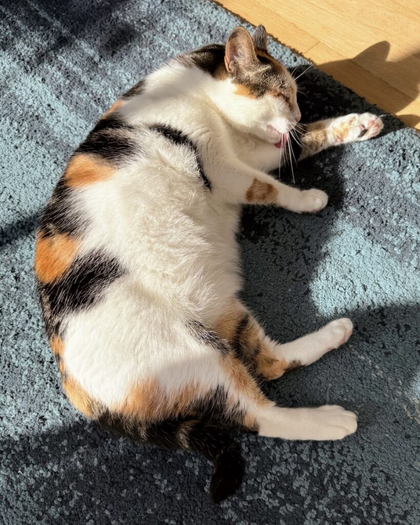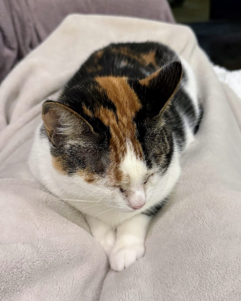 Manuka is a calico girl with bright green eyes, snowy white paws, and a soft white belly that’s just as lovely as she is. When she feels comfortable, her playful side shines – she loves chasing toys and zooming around the house, turning everyday moments into little bursts of fun.