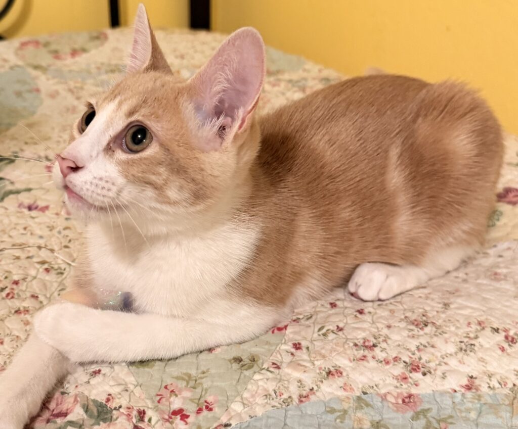 Cashew is the biggest of his siblings, but he is a gentle giant. This mellow kitten is a lap cat in training, and likes to greet his foster parent when they enter a room.