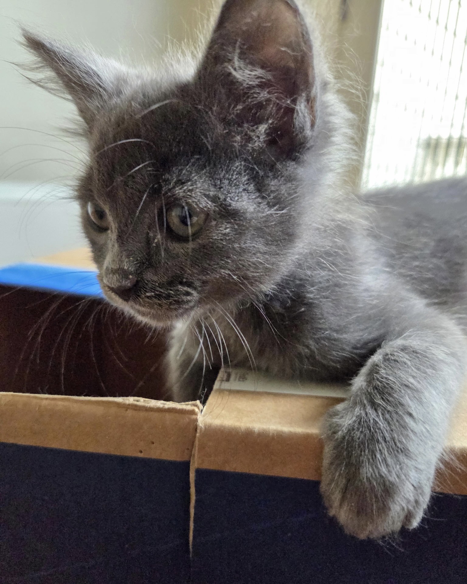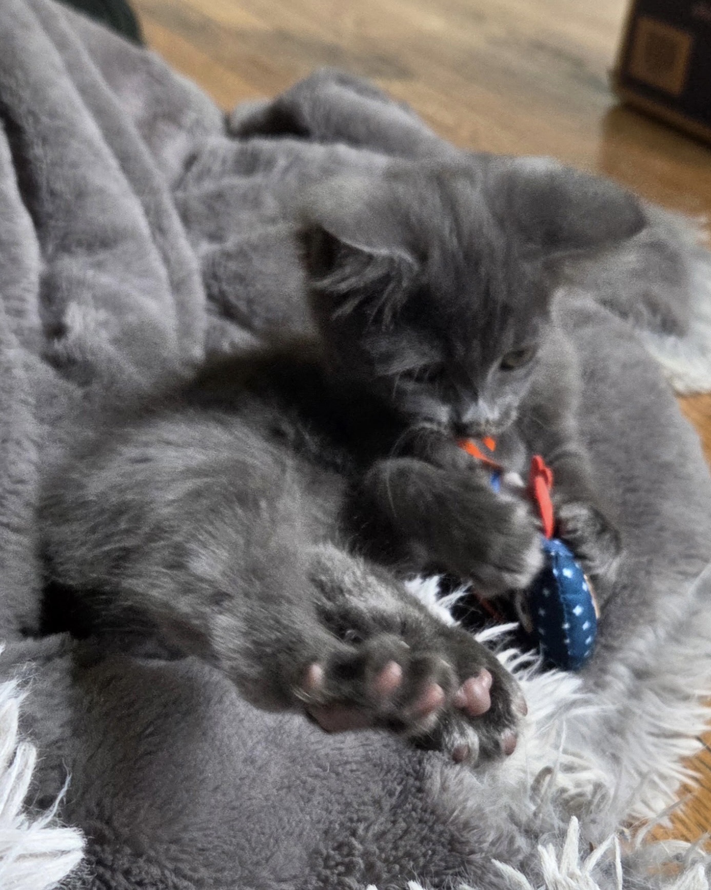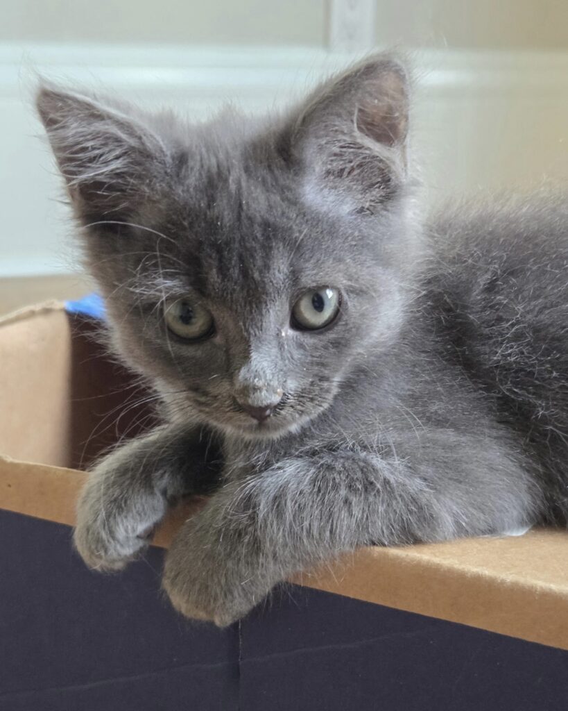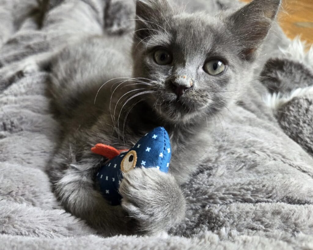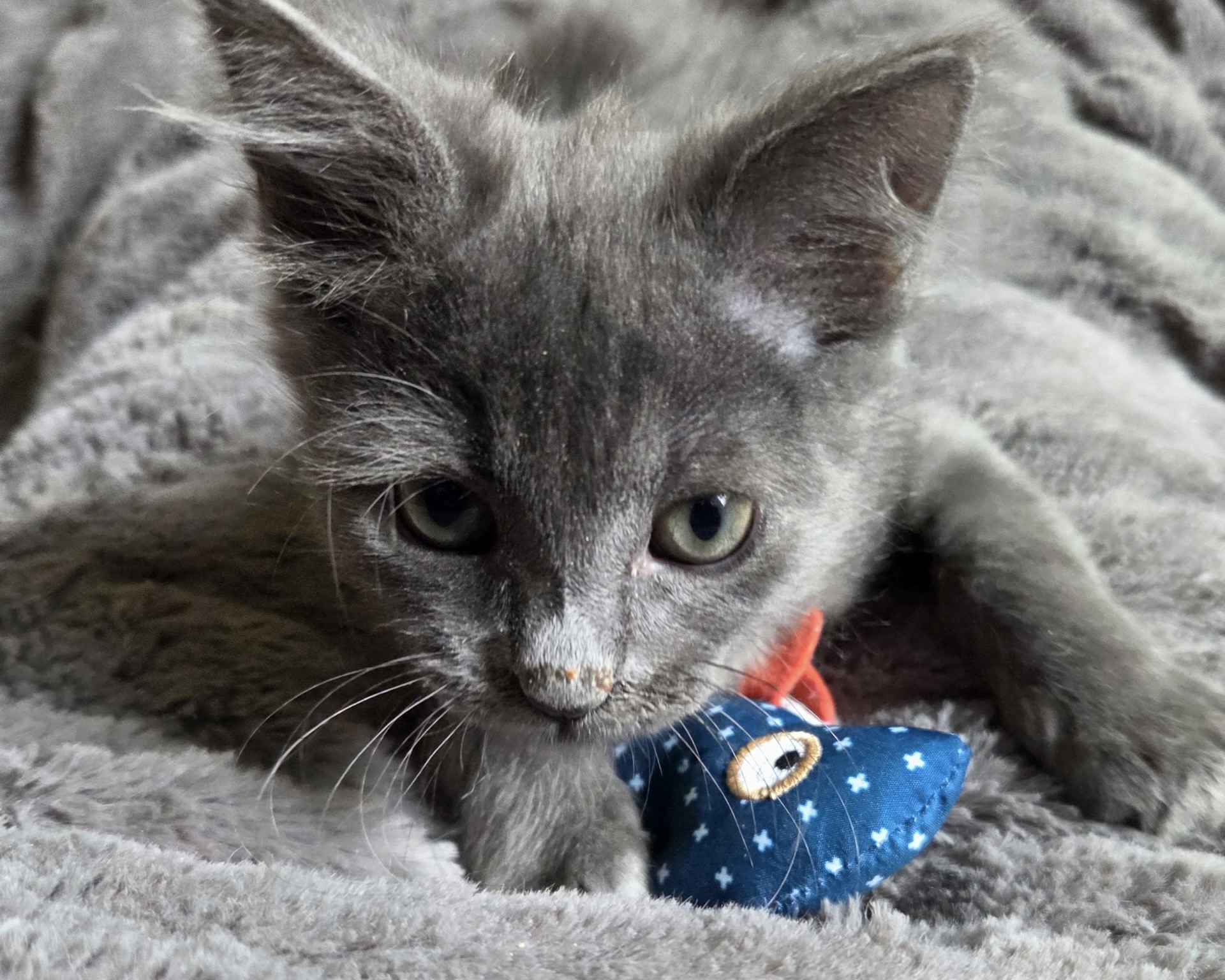 Breezy is the perfect “designer” gray kitten who is beautiful inside and out. He is gentle, affectionate, friendly, cuddly, and playful. He is a goofy purr monster.