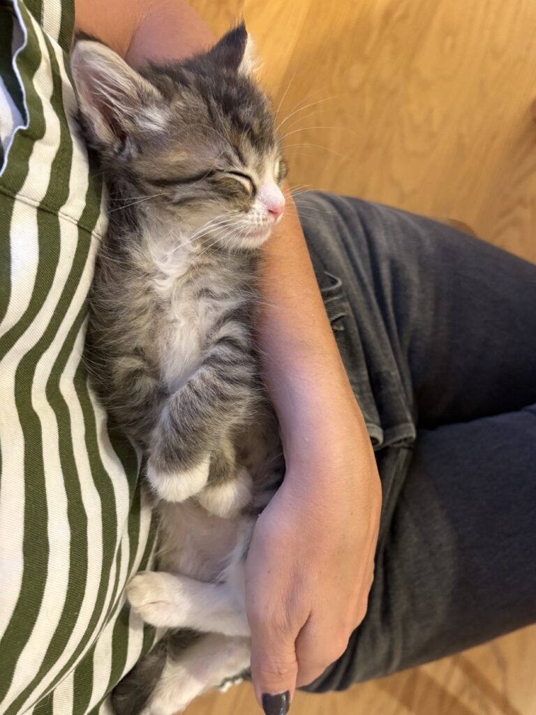 Pipers is the definition of cuddly. She loves gentle pets, nose rubs, and giving affection just as much as she loves receiving it. Her calm, loving nature makes her the perfect companion for anyone looking for a sweet kitten to form a close bond with. Pipers is also great with kids!