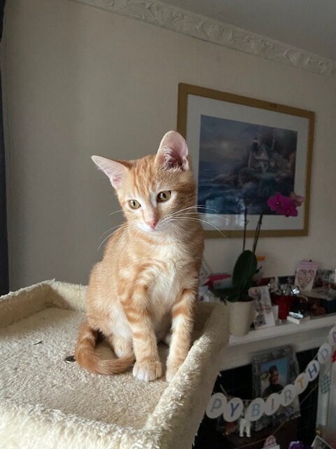 She loves furry feathery toys and chilling in her cat tree hammock. Shoelaces are especially intriguing! She also enjoys climbing the cat tree and playing chase with her brother Yuzu.