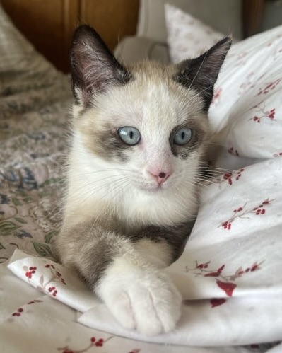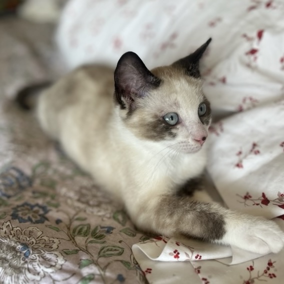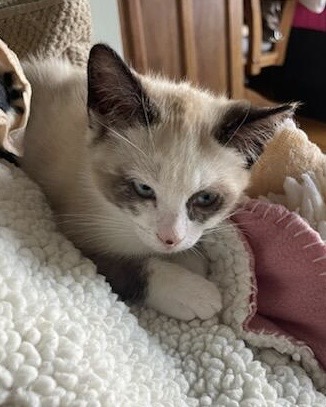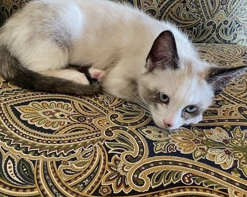 Amy is a nice little Siamese girl who loves to play and have fun with other kittens. She will be a bit shy in her new home at first, because she was born to a feral mother and not around humans during her first five weeks of life. It took her awhile to trust humans and to like being picked up, but she is now very comfortable in a home.
