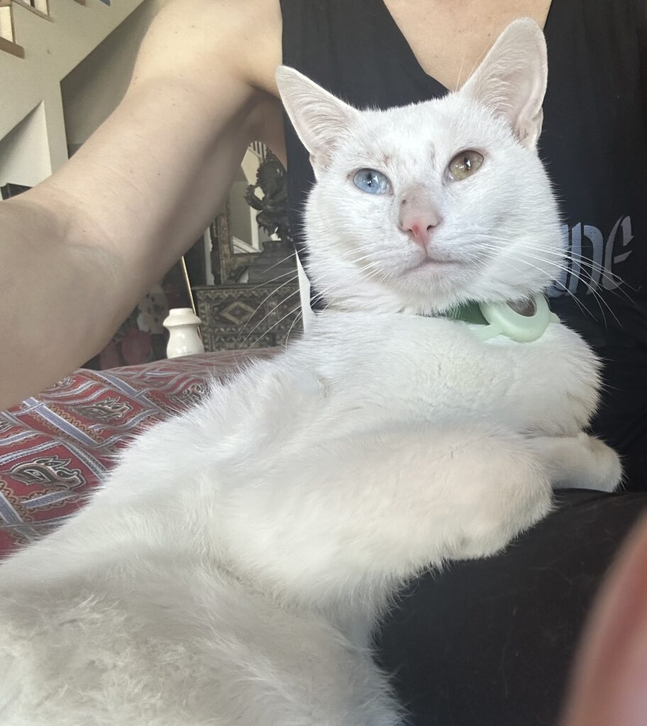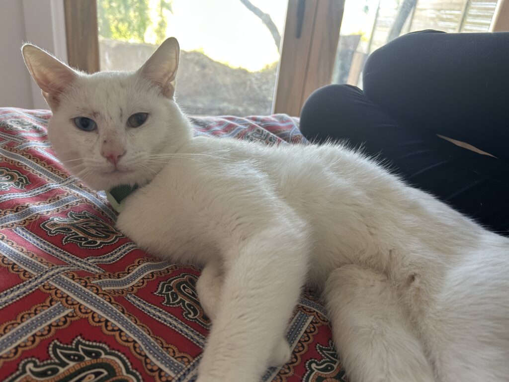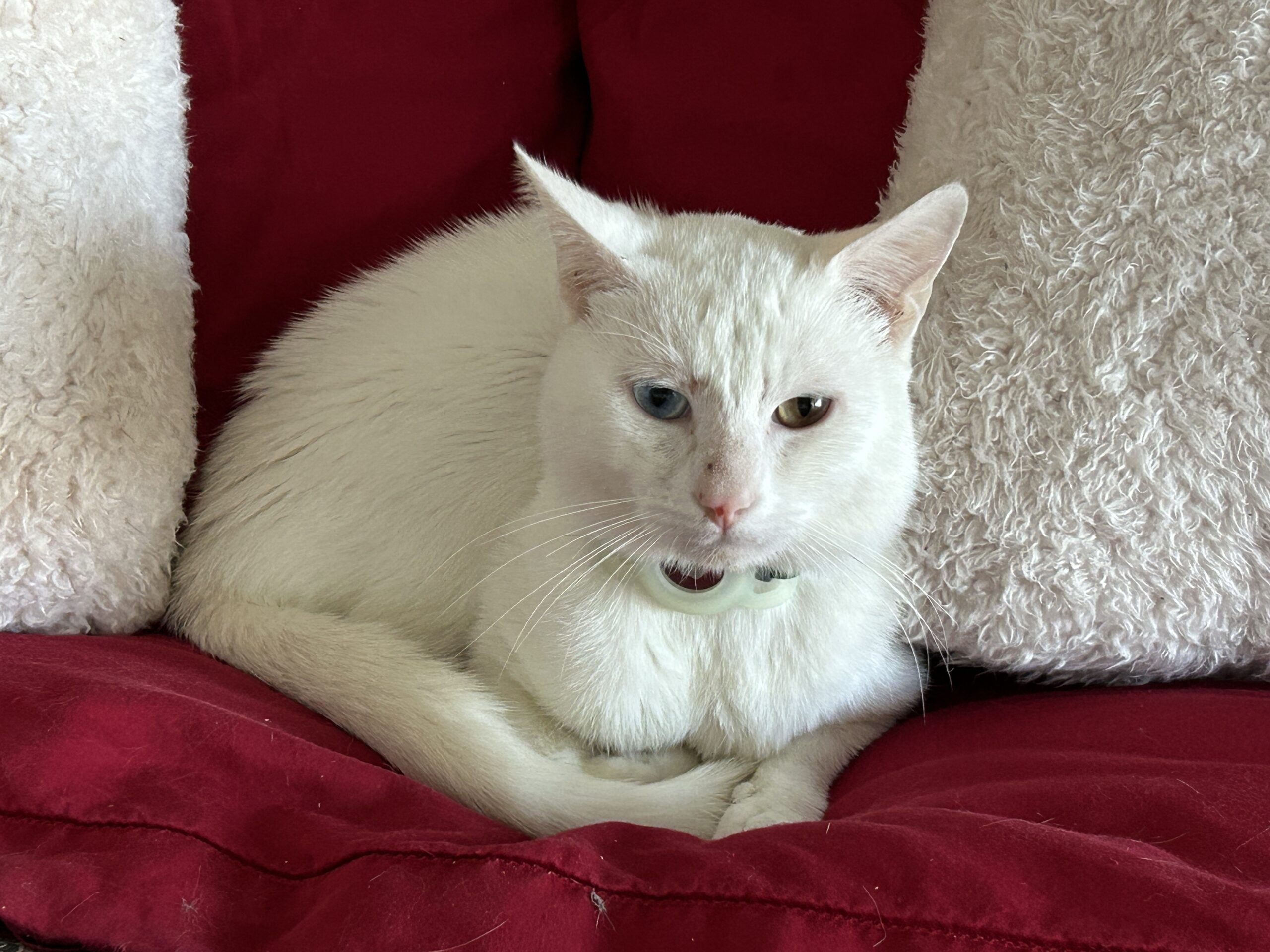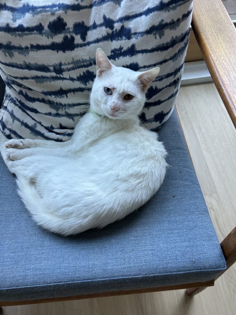 I’m an all-white boy with striking eyes—one is a sunny yellow and the other is a beautiful blue. I think I’m about a year old, and my biggest goal in life is to be with you.