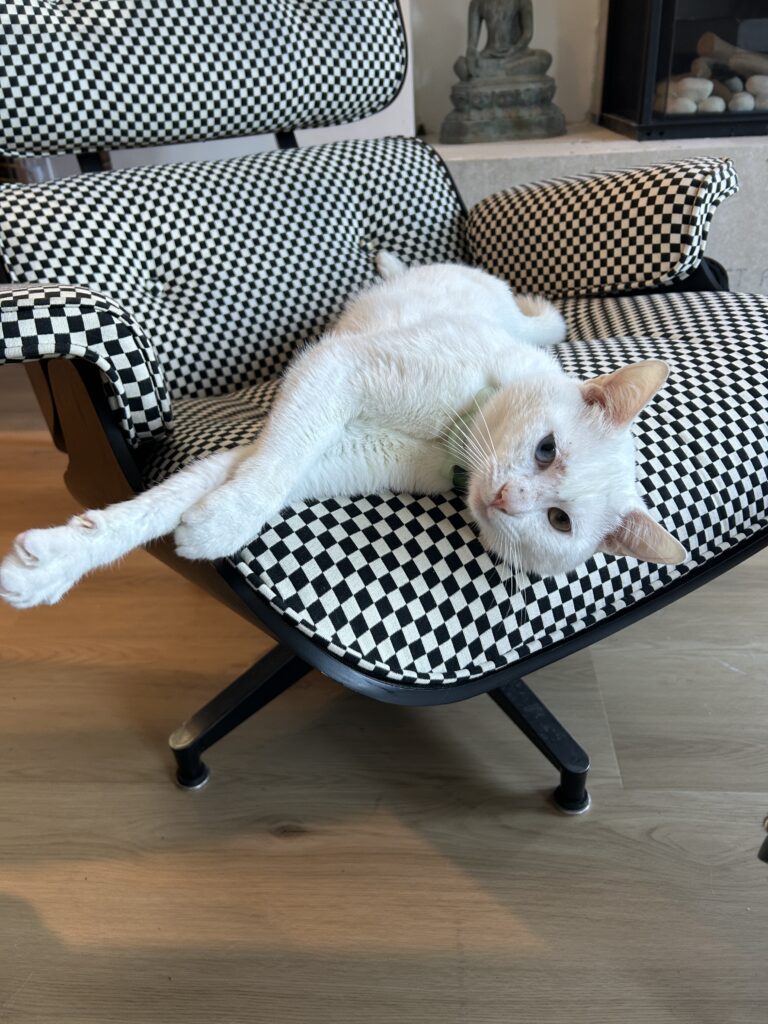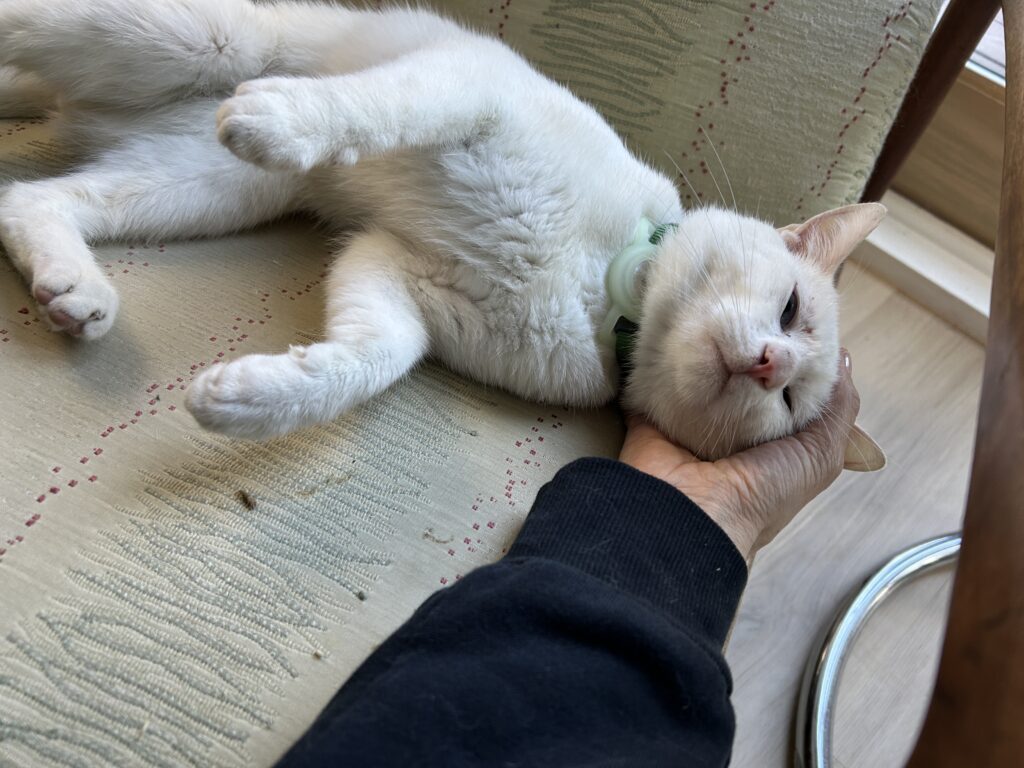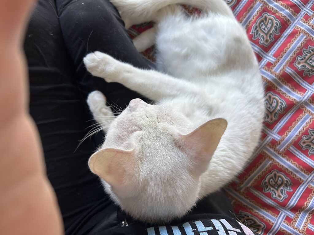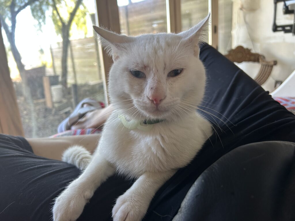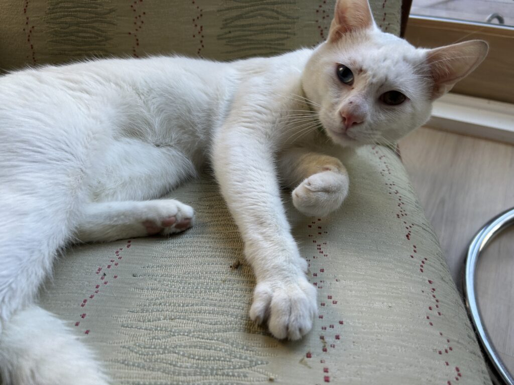 I’m an all-white boy with striking eyes—one is a sunny yellow and the other is a beautiful blue. I think I’m about a year old, and my biggest goal in life is to be with you.