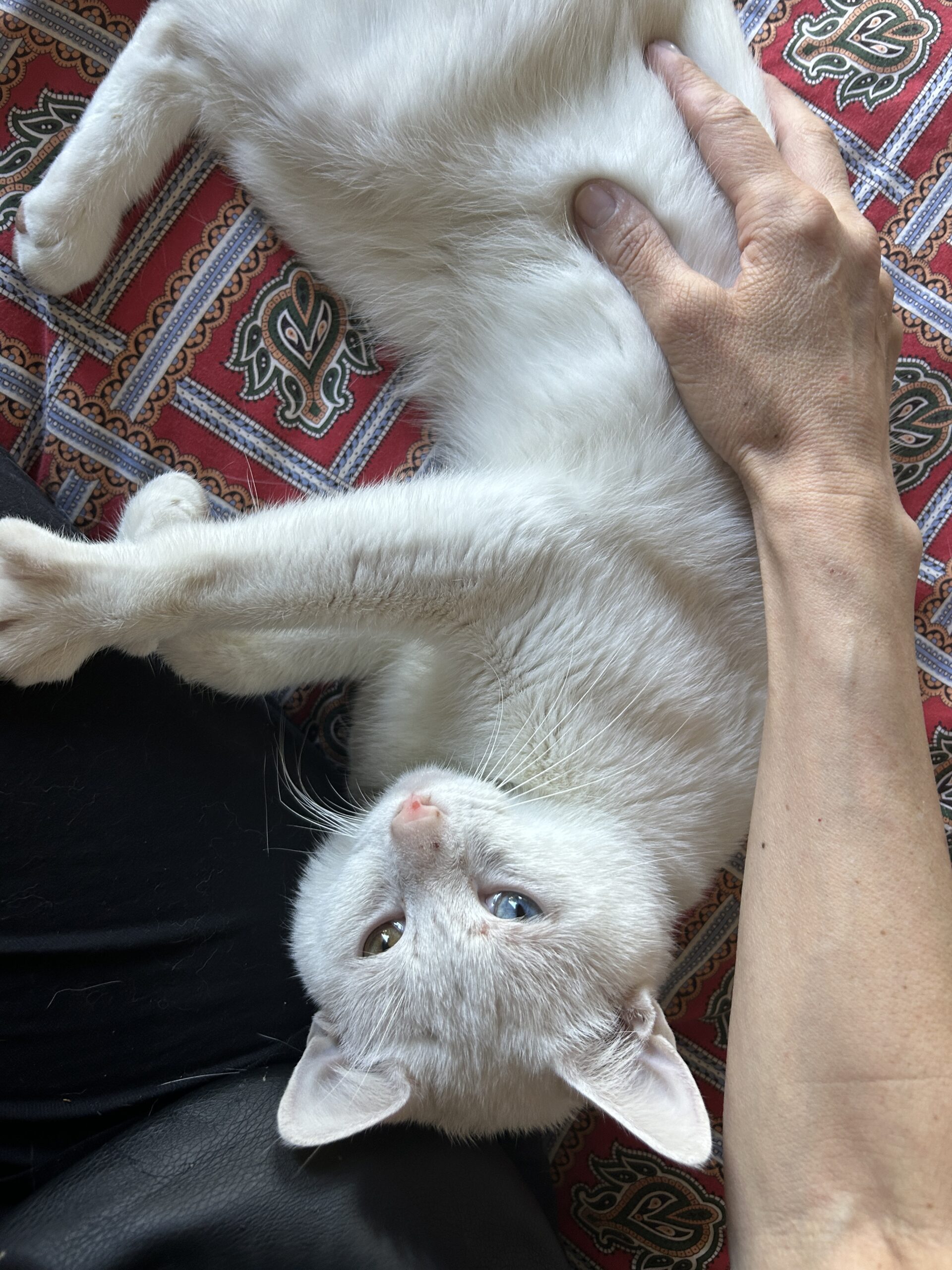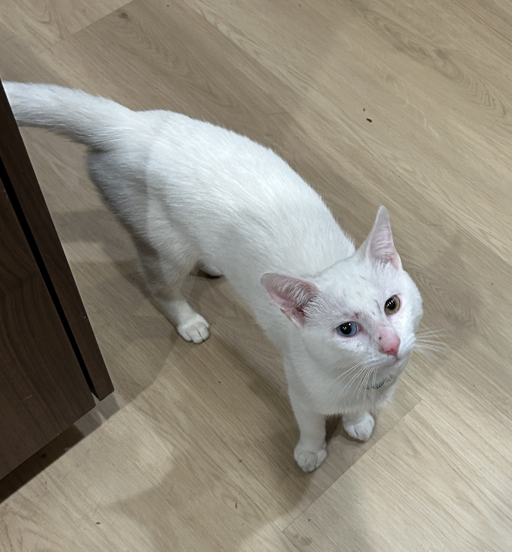 I’m an all-white boy with striking eyes—one is a sunny yellow and the other is a beautiful blue. I think I’m about a year old, and my biggest goal in life is to be with you.