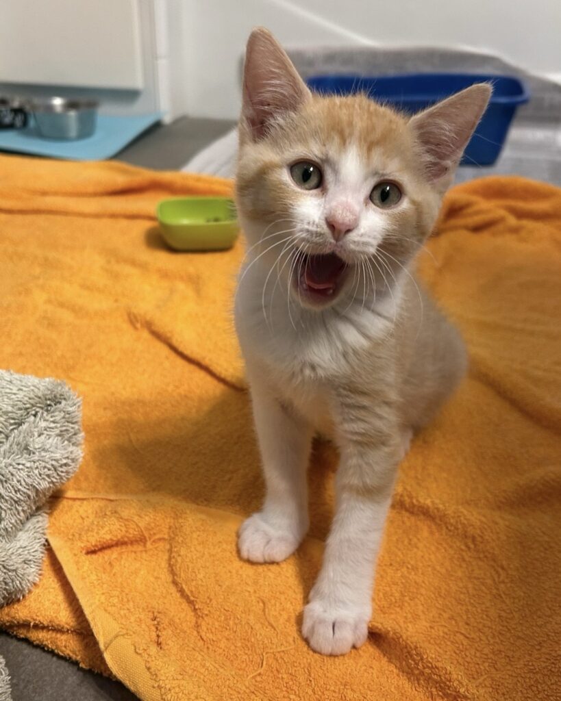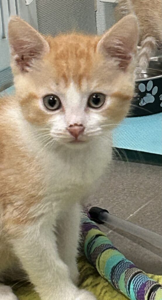 Mandarin tested faintly positive for FIV (Feline immunodeficiency virus). This does not mean that he has FIV: The test measures antibodies, not presence of the virus. It indicates only that he has been exposed—he most likely inherited these antibodies from his mother, which is common in young kittens. Mandarin’s most recent test showed even a fainter reaction, and we believe that it will revert to negative within a few months.