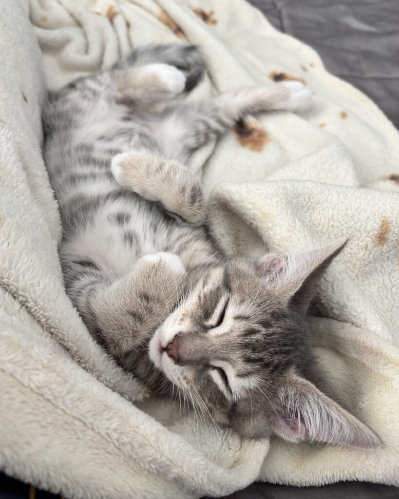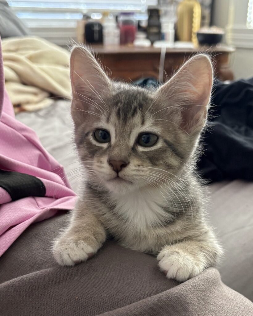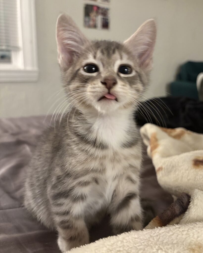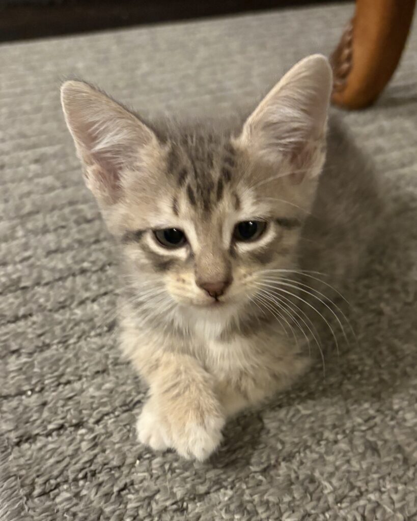 Barnacle is a grey striped tabby with white toes. He is silly, brave, and affectionate. He is often playing with Scampi or another sibling, and he will come right up to your feet if he wants to play with you too. While he is one of the more playful kittens, he also loves to be picked up and held close to receive attention and love. When he is sleeping you can sometimes see his magnificent belly spots! He often makes very funny faces, including crossing his eyes or sticking out his tongue.