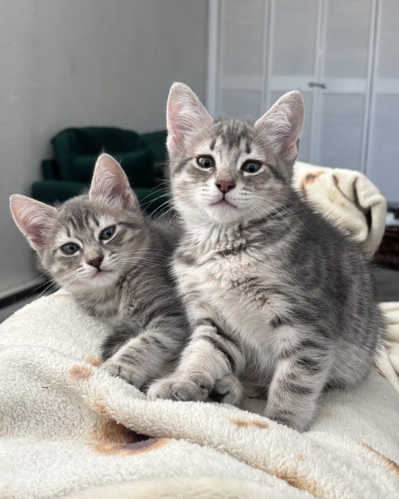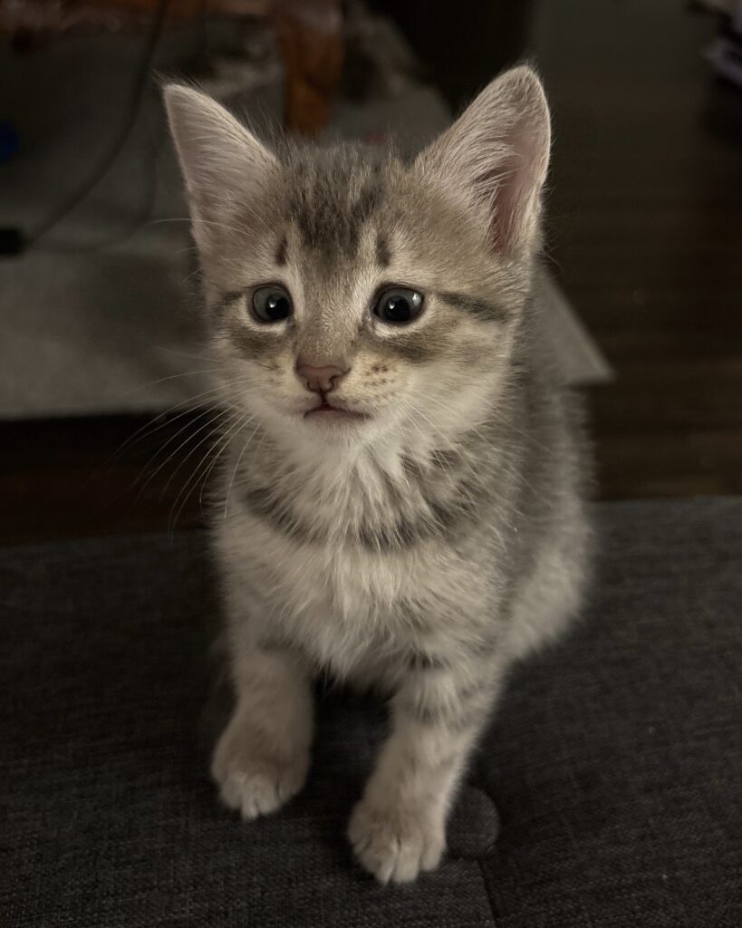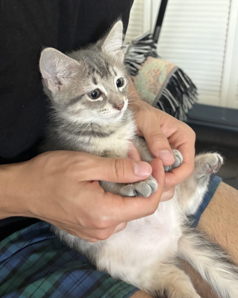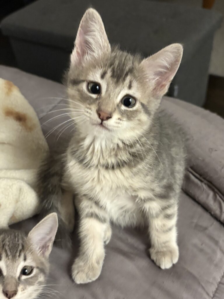 Clam looks like her mother’s mini-me! She is all grey tabby and all fun! She is a curious, cuddly kitten who, like her sister Shrimp, has a great balance of play and rest in her daily routine. She loves a good cuddle in your arms or laying down. She also loves to explore her foster’s apartment and jump around while playing with feather wands.