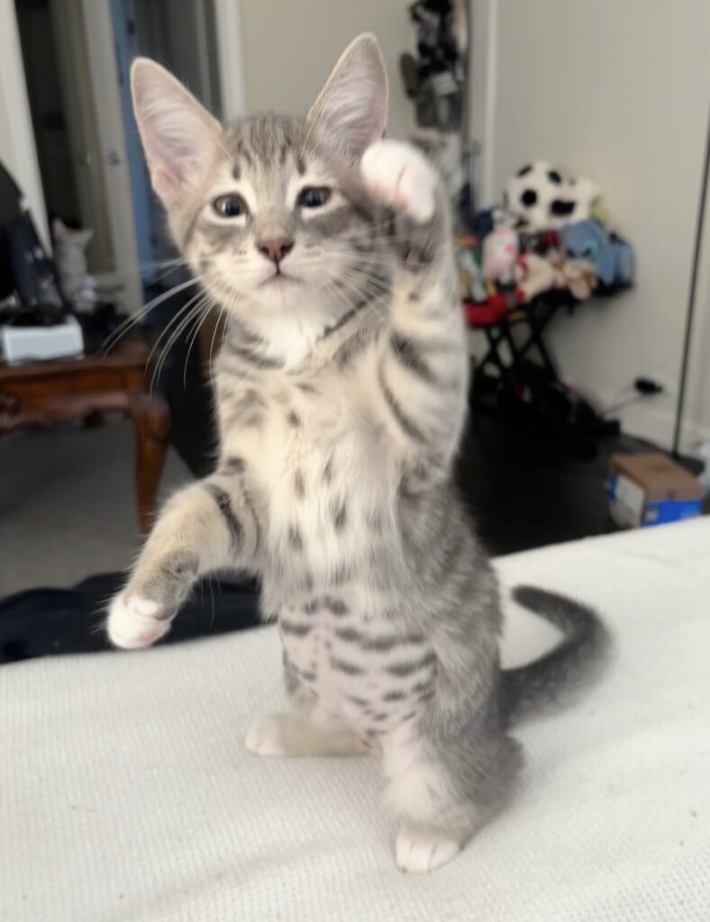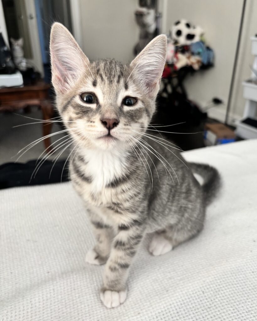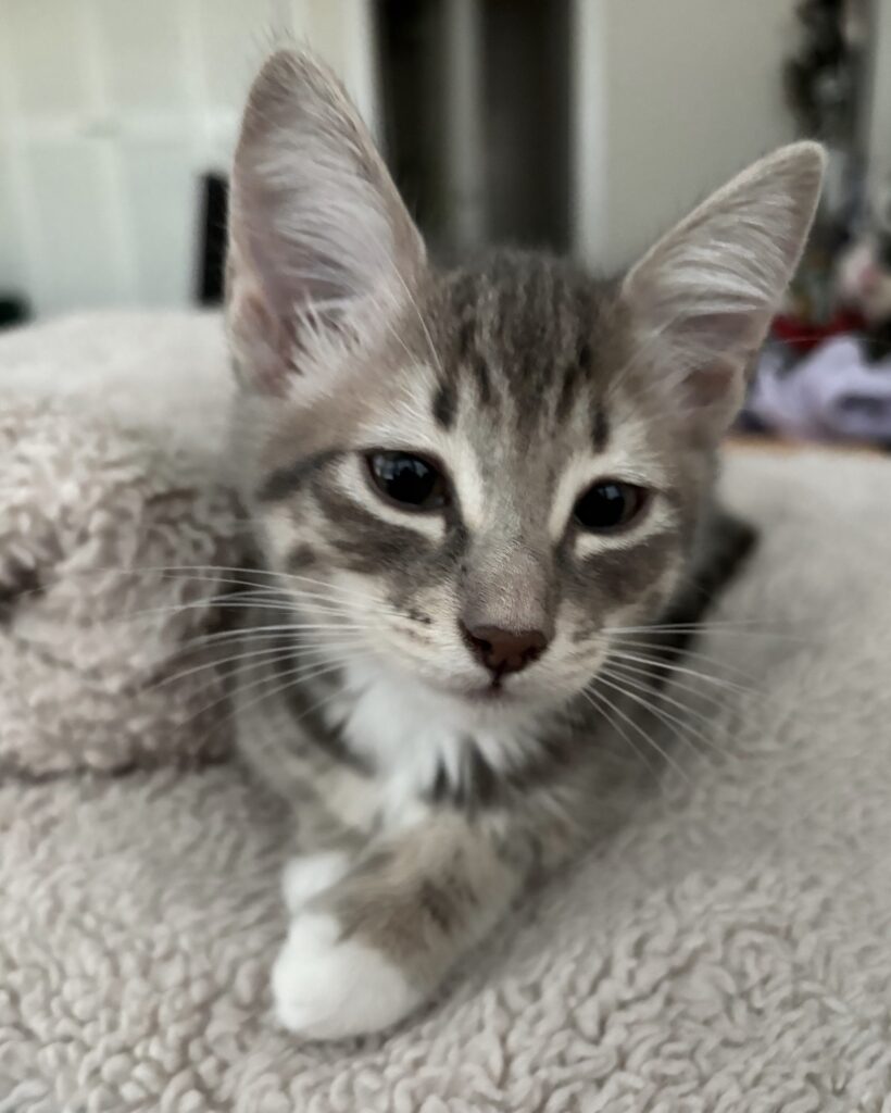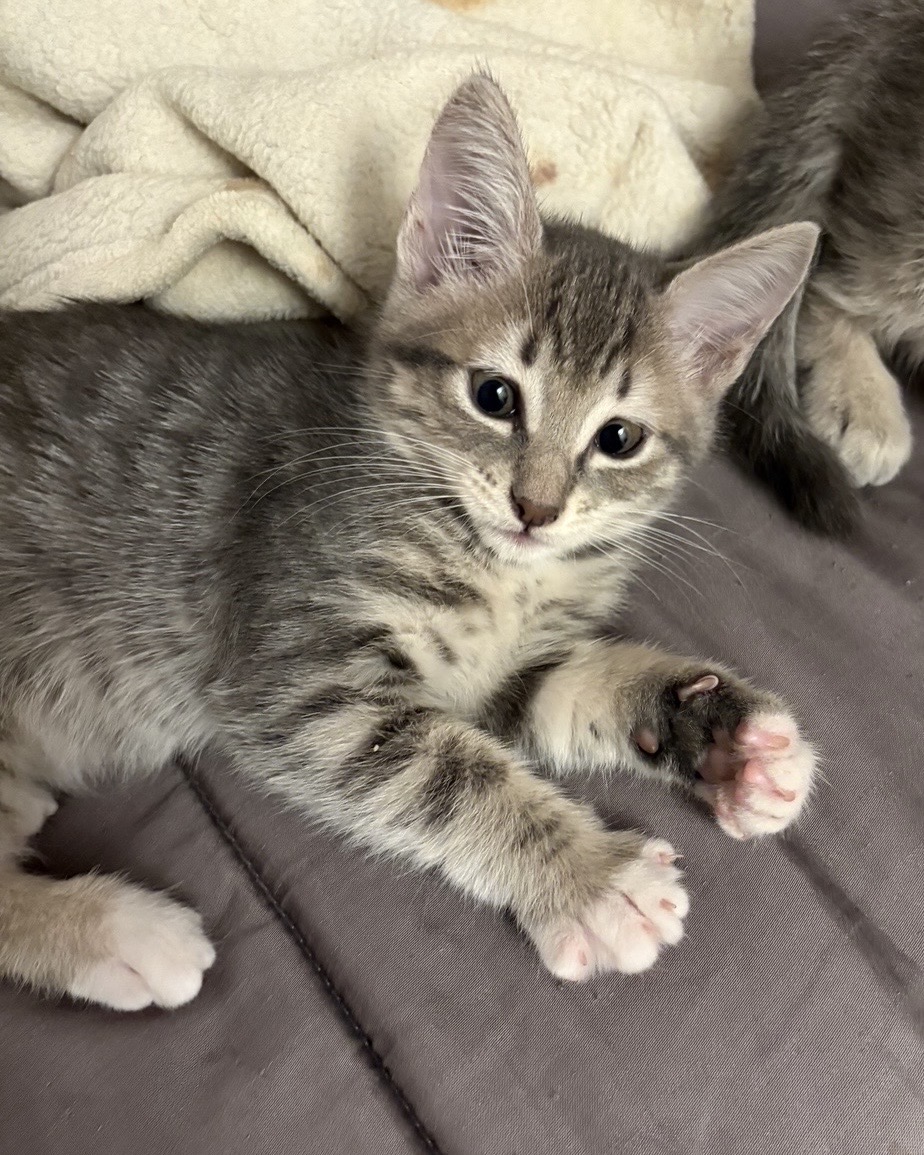 Krill is a little grey tabby girl with white mittens. She can get comfy anywhere, and curl right up to take a nap. Krill enjoys wrestling with her siblings, although she is one of the smallest of her siblings. While she used to be a little shy, her confidence has started to shine over the last few weeks and she is more comfortable playing. Krill is also learning the joys of cuddling, lying down next to people for a cozy snooze.
