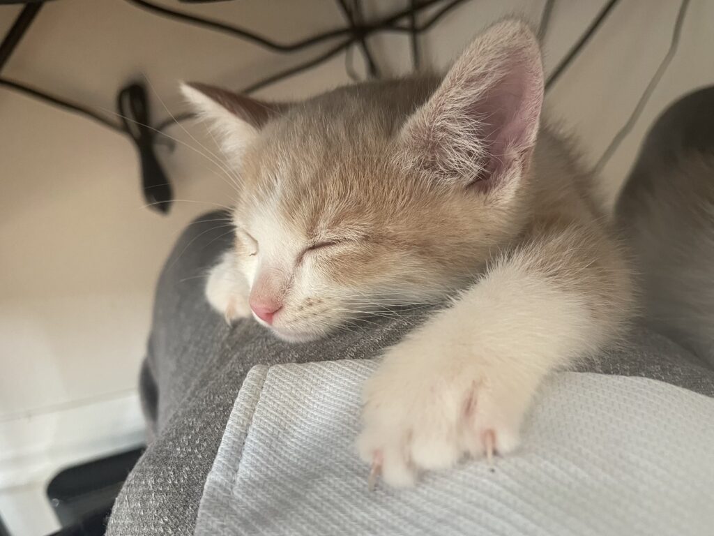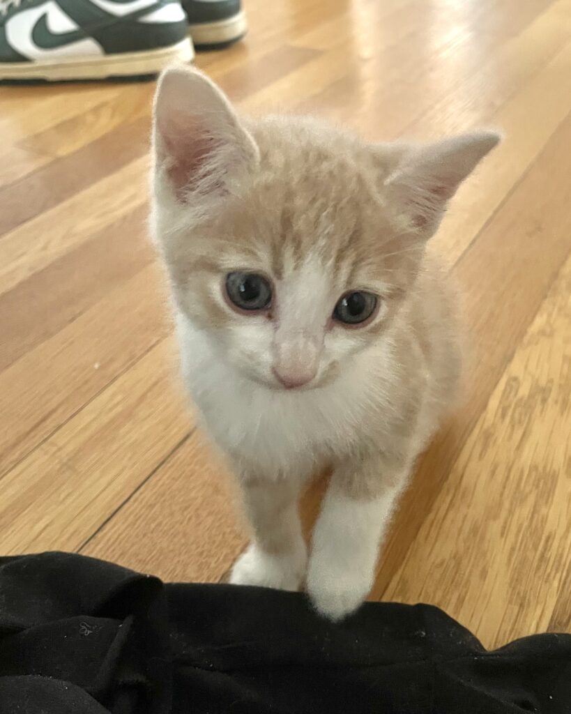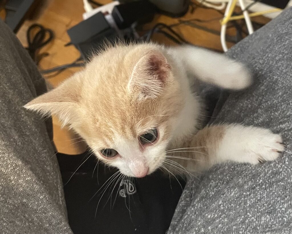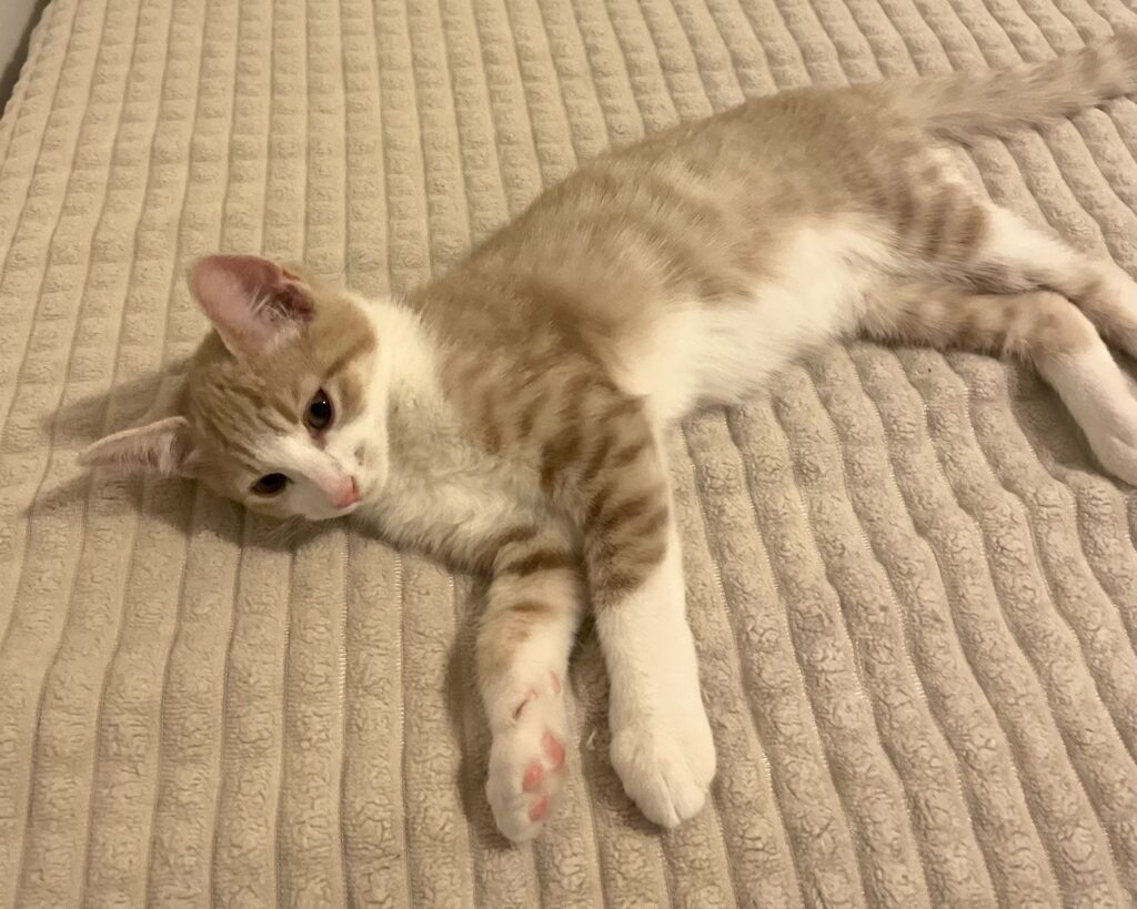 Jim is a little cautious of new surroundings at first, but quickly warms up and runs around with the kitten zoomies! He loves to play with toys and wrestle with his brother. But he also wants to be right near you – following you around the house. When he’s done with playing, he will cuddle up with you and settle in for a contented nap.