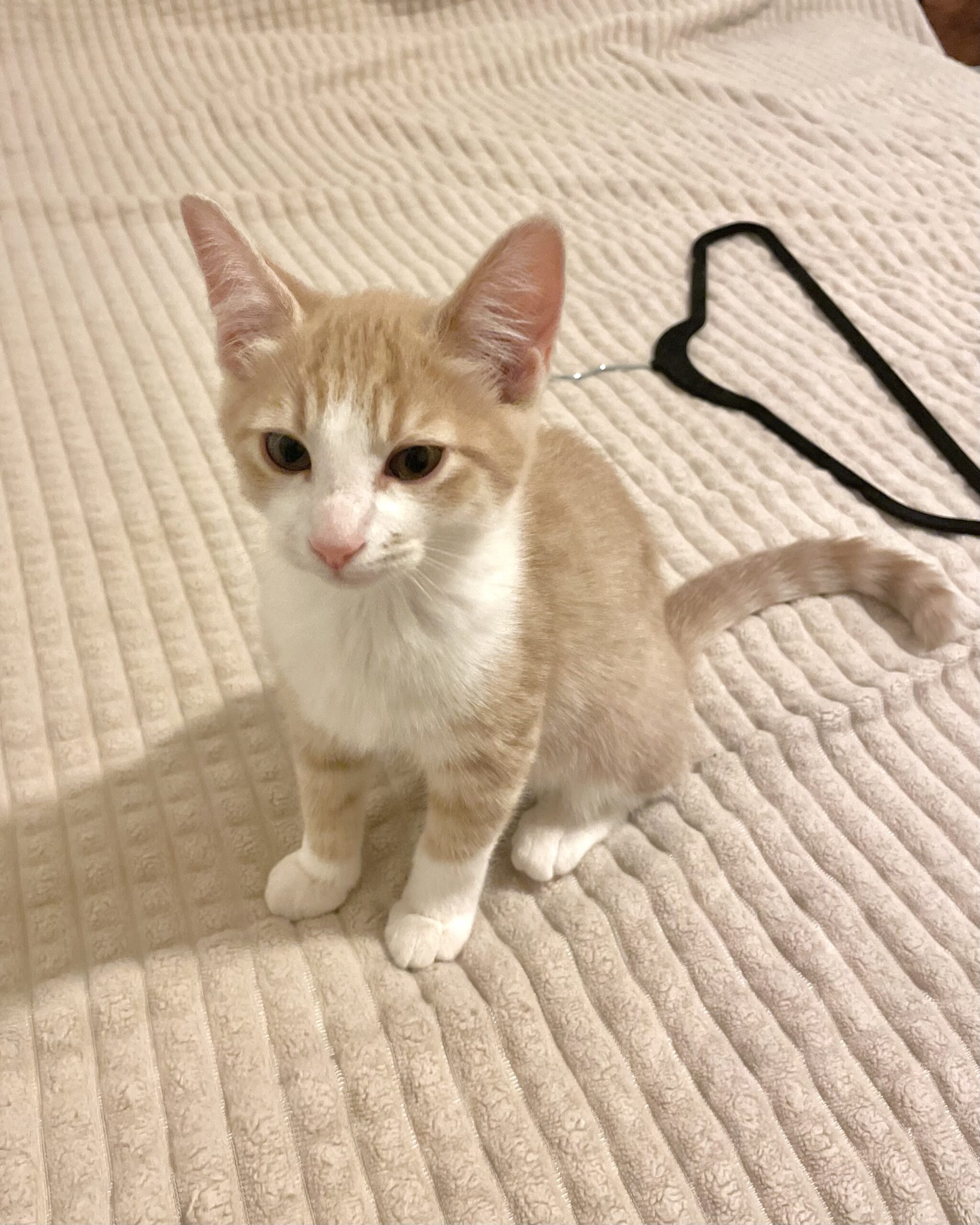 Jim is a little cautious of new surroundings at first, but quickly warms up and runs around with the kitten zoomies! He loves to play with toys and wrestle with his brother. But he also wants to be right near you – following you around the house. When he’s done with playing, he will cuddle up with you and settle in for a contented nap.