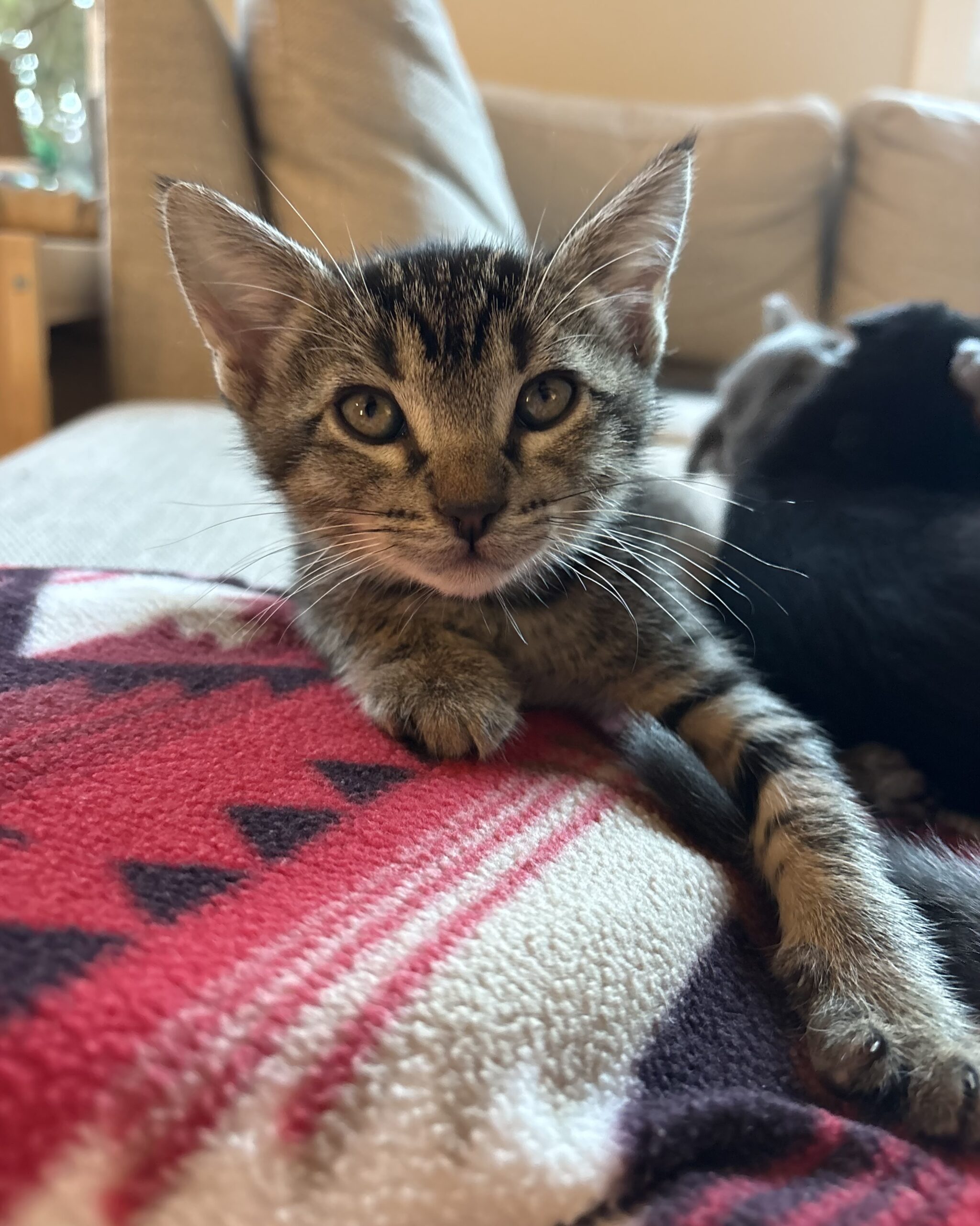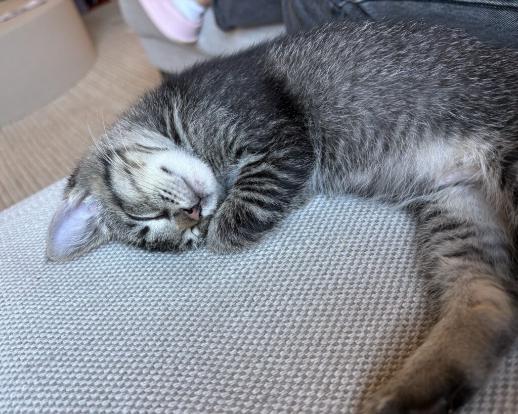 Ben is a spirited dark gray tabby kitten with a big personality and an even bigger heart. He’s playful, bold, and full of confidence – the first to chase a toy, climb to new heights, or start a game with his friends. This little adventurer has a feisty streak that keeps things exciting, but he’s also incredibly loving once playtime winds down.