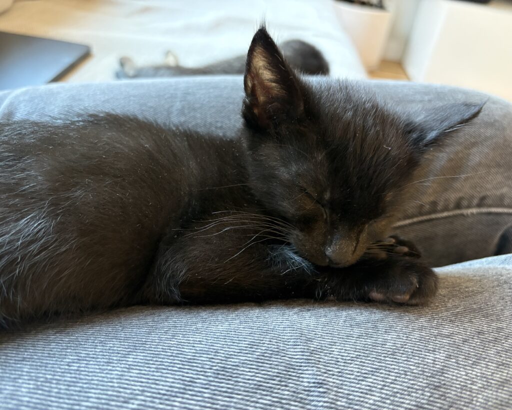 Bill is a handsome black kitten with a heart full of love and a purr that never stops. He’s one of those kittens who seems to think he has to work extra hard to be loved – always close by, gazing up at you with bright eyes, and offering endless cuddles and gentle head bumps.