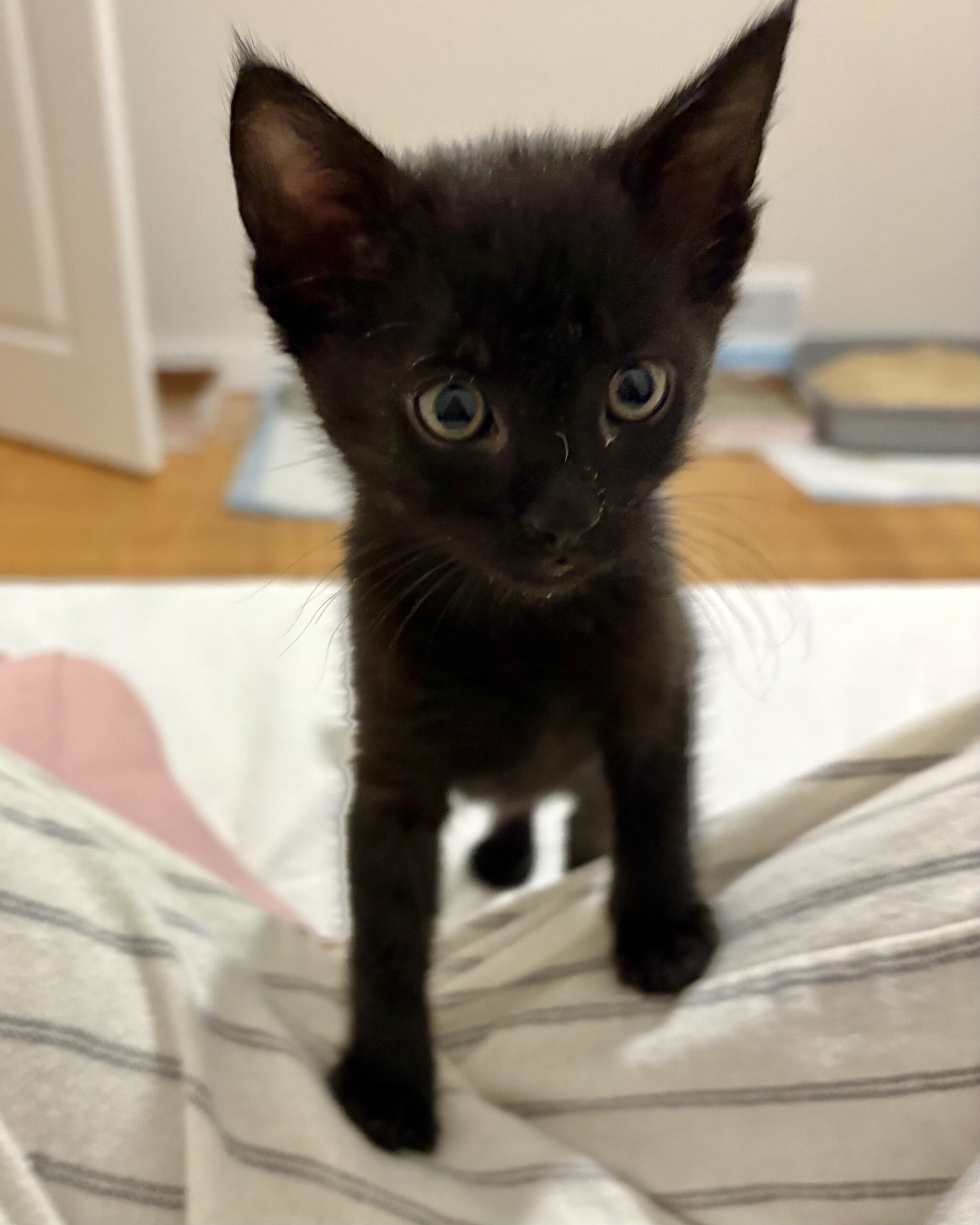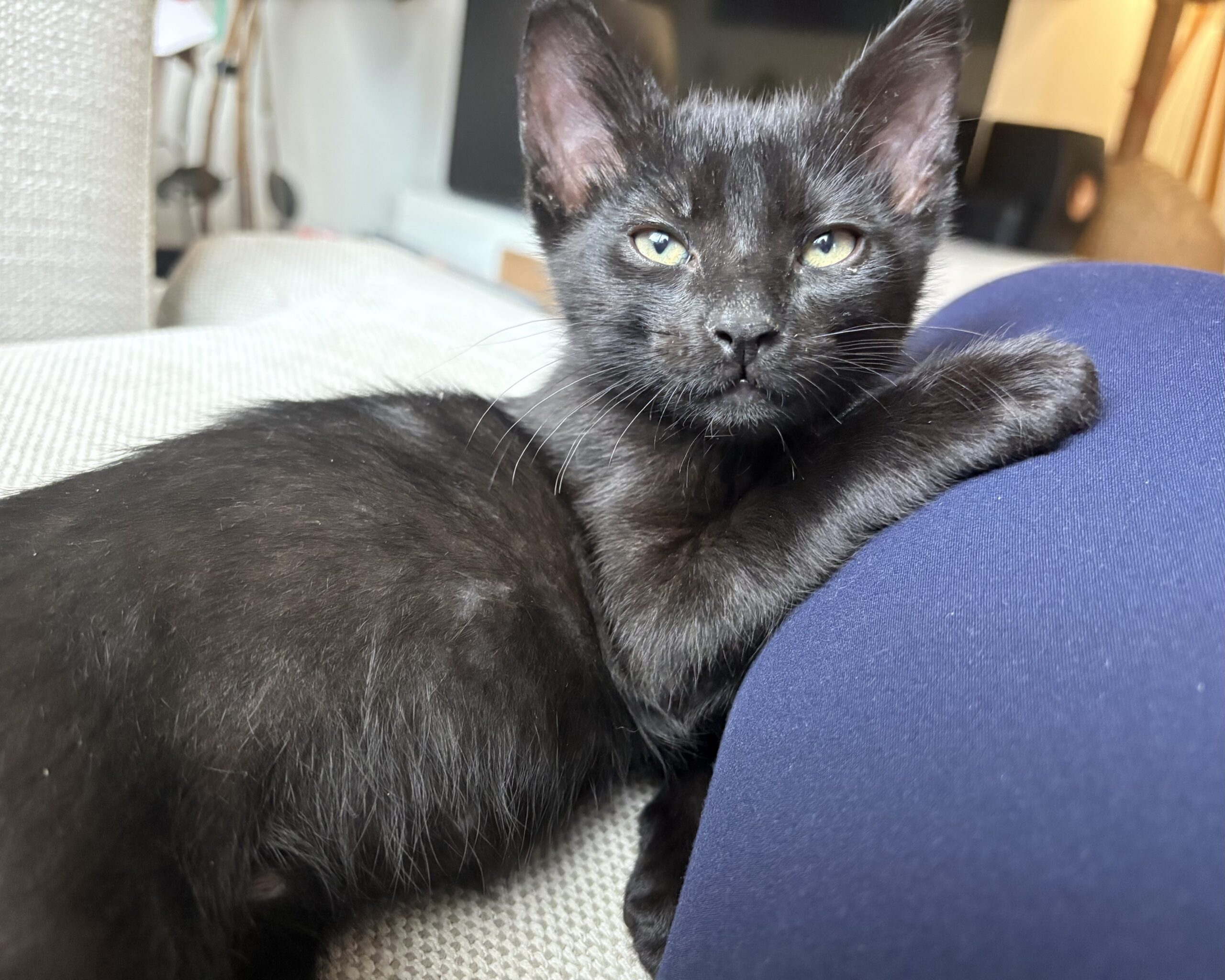 Bill is a handsome black kitten with a heart full of love and a purr that never stops. He’s one of those kittens who seems to think he has to work extra hard to be loved – always close by, gazing up at you with bright eyes, and offering endless cuddles and gentle head bumps.