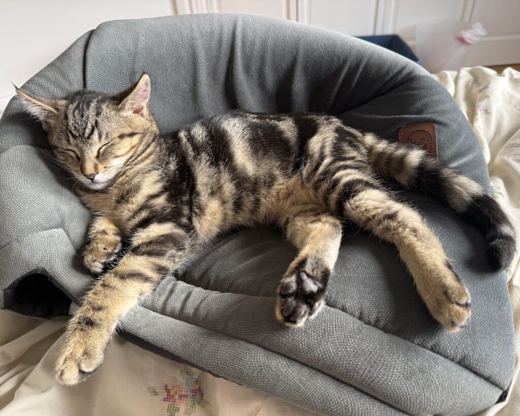 Meet Pilgrim! This handsome brown tabby boy is a curious little explorer with the most stunning dark stripes that look like they were brushed on by an artist. Pilgrim’s always on a mission – whether he’s chasing toys, investigating every corner of the room, or climbing into your lap for a well-deserved nap after a big adventure.