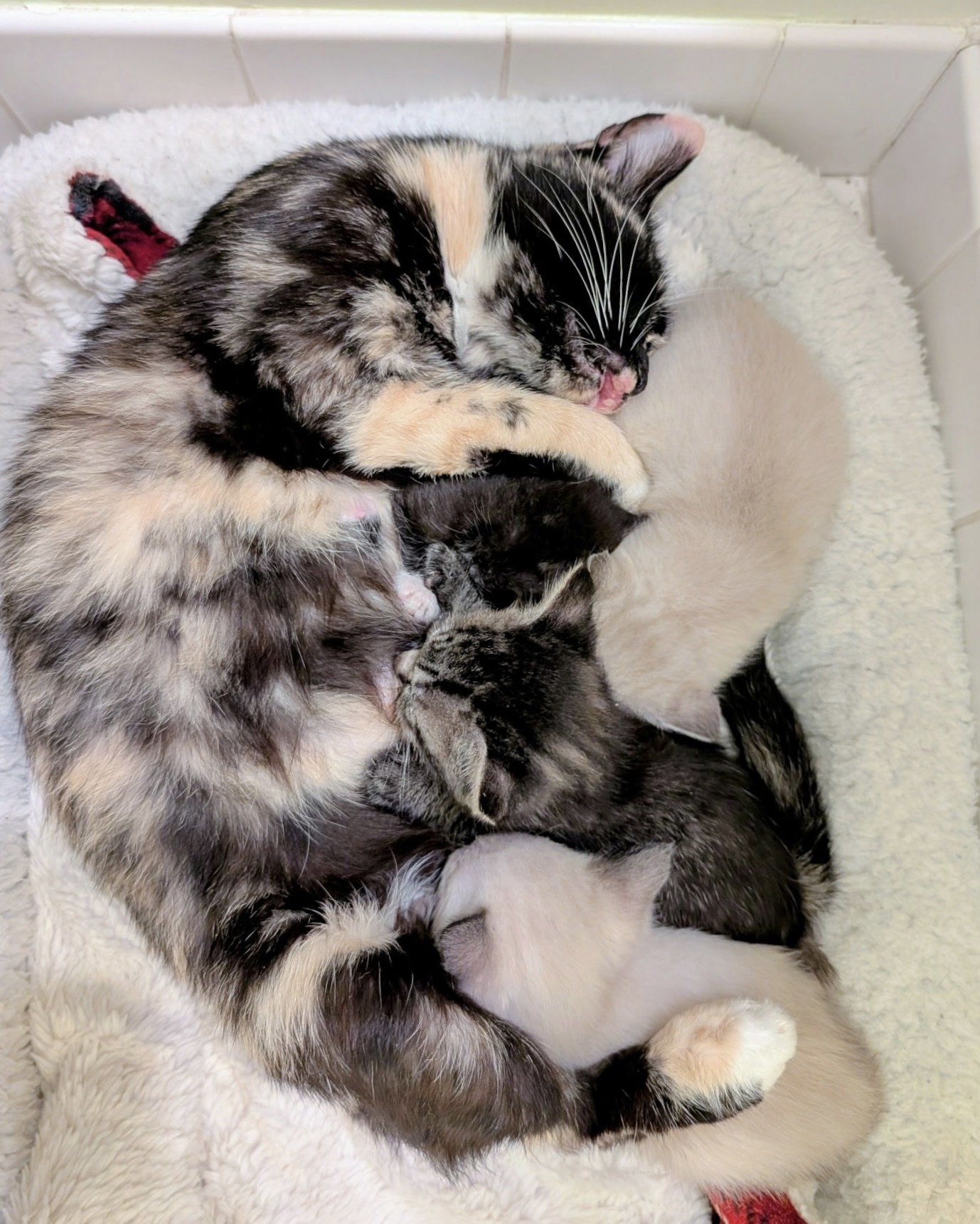 This gentle girl has just finished raising her kittens and is officially off duty – but she still has plenty of love to give. Margot is affectionate to her core. Once she’s made sure everyone is safe and accounted for (a mom’s job is never truly done!), she’ll hop up beside you, chirp softly for attention, and melt into pets and ear scratches.