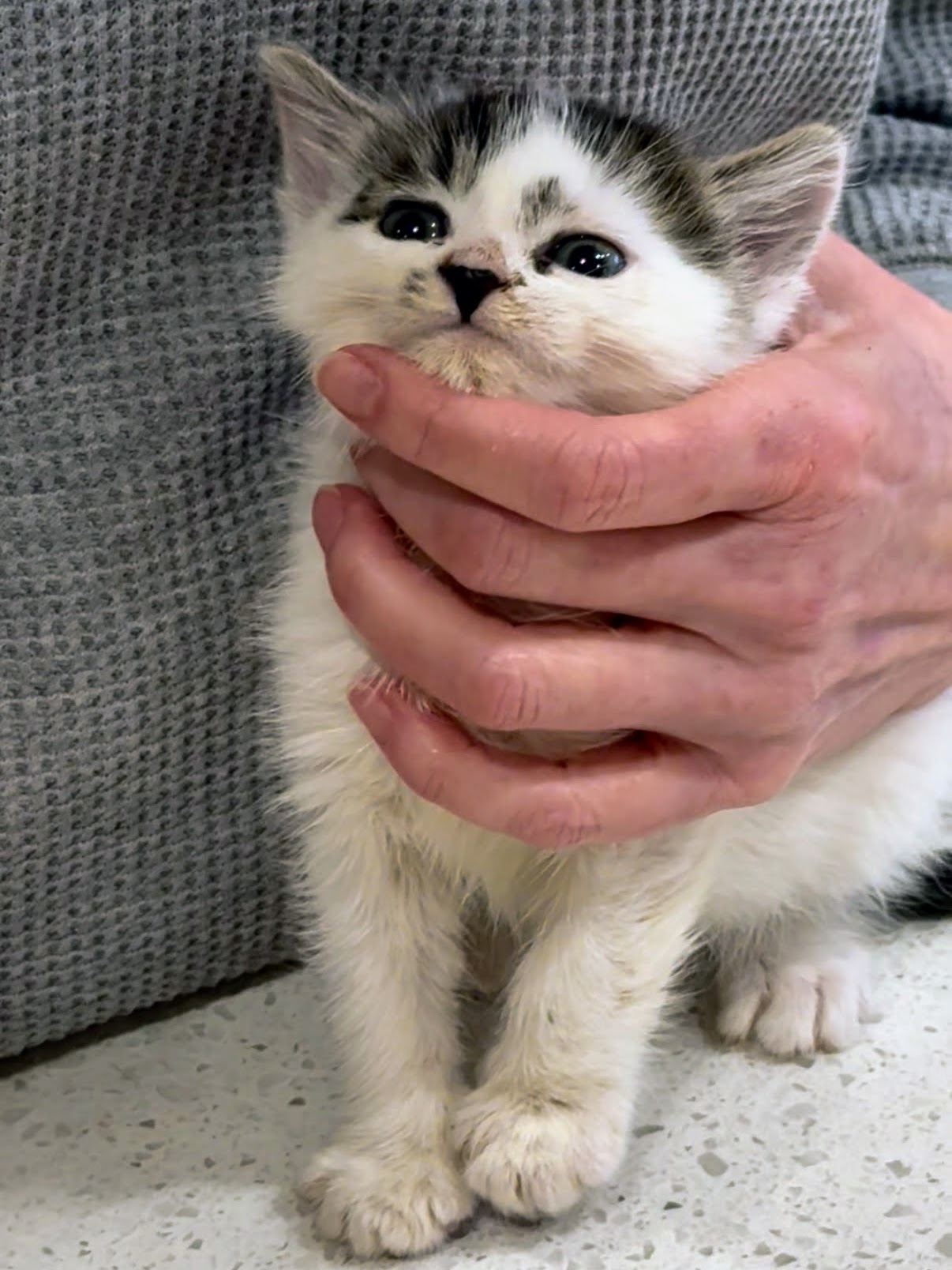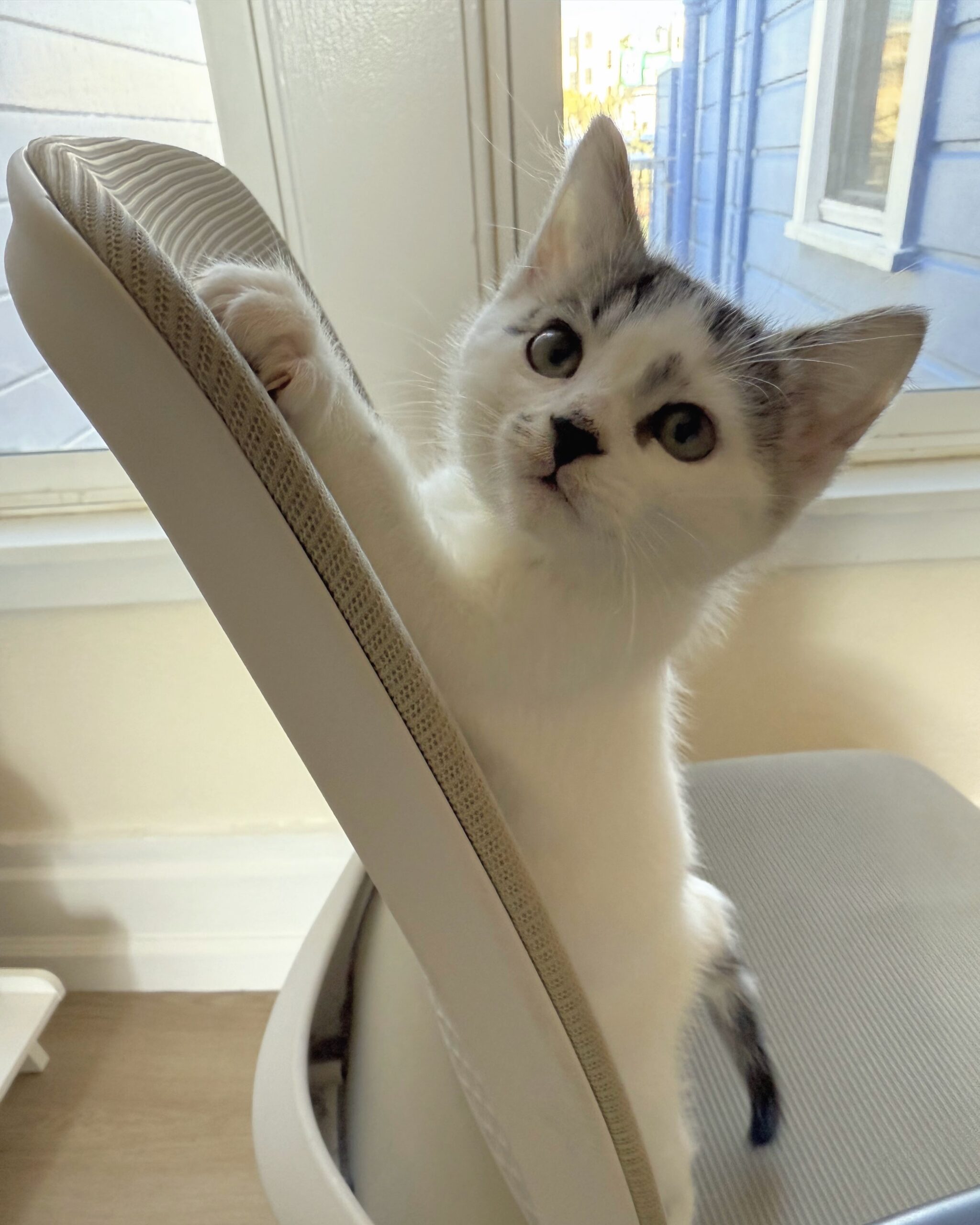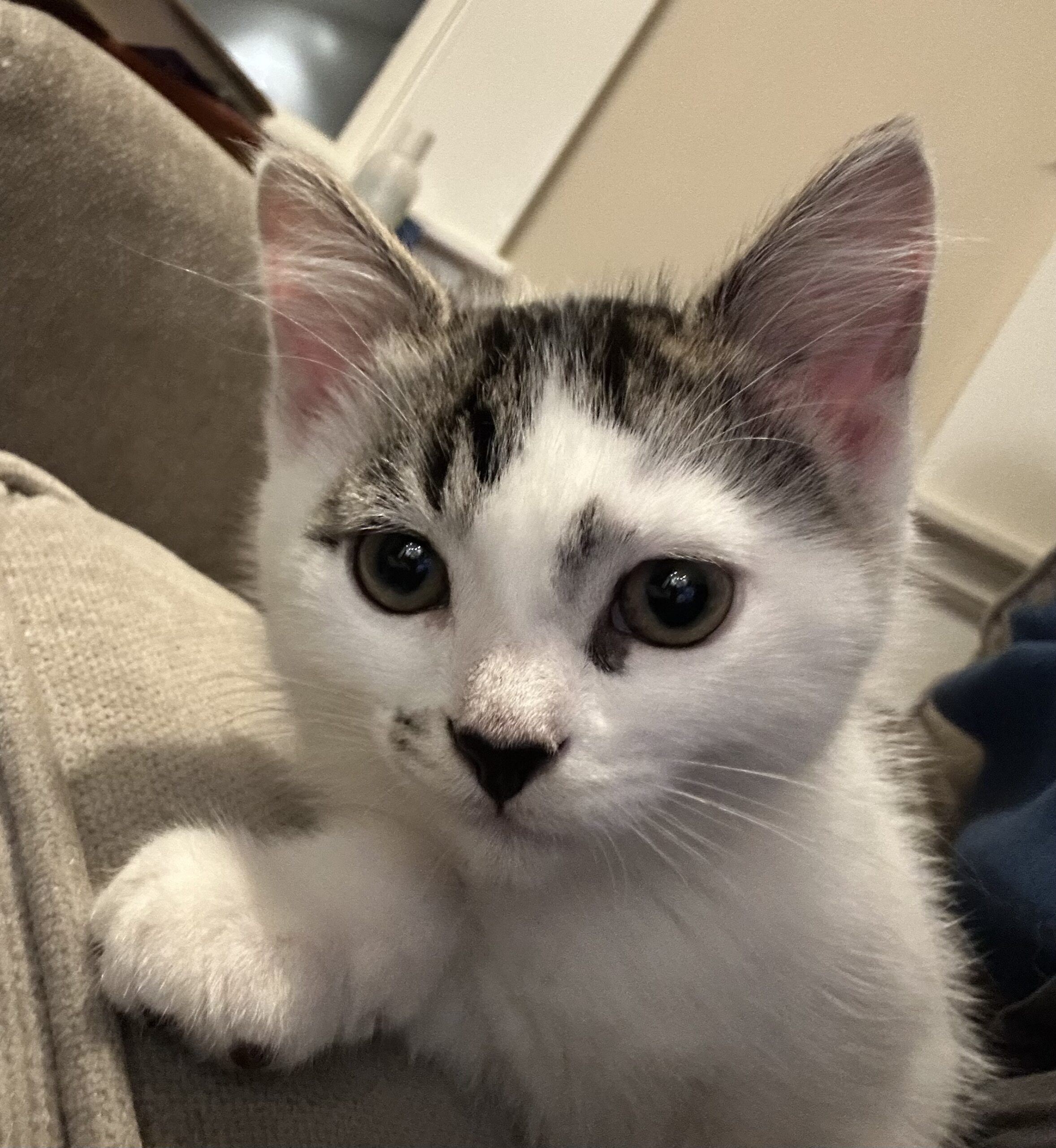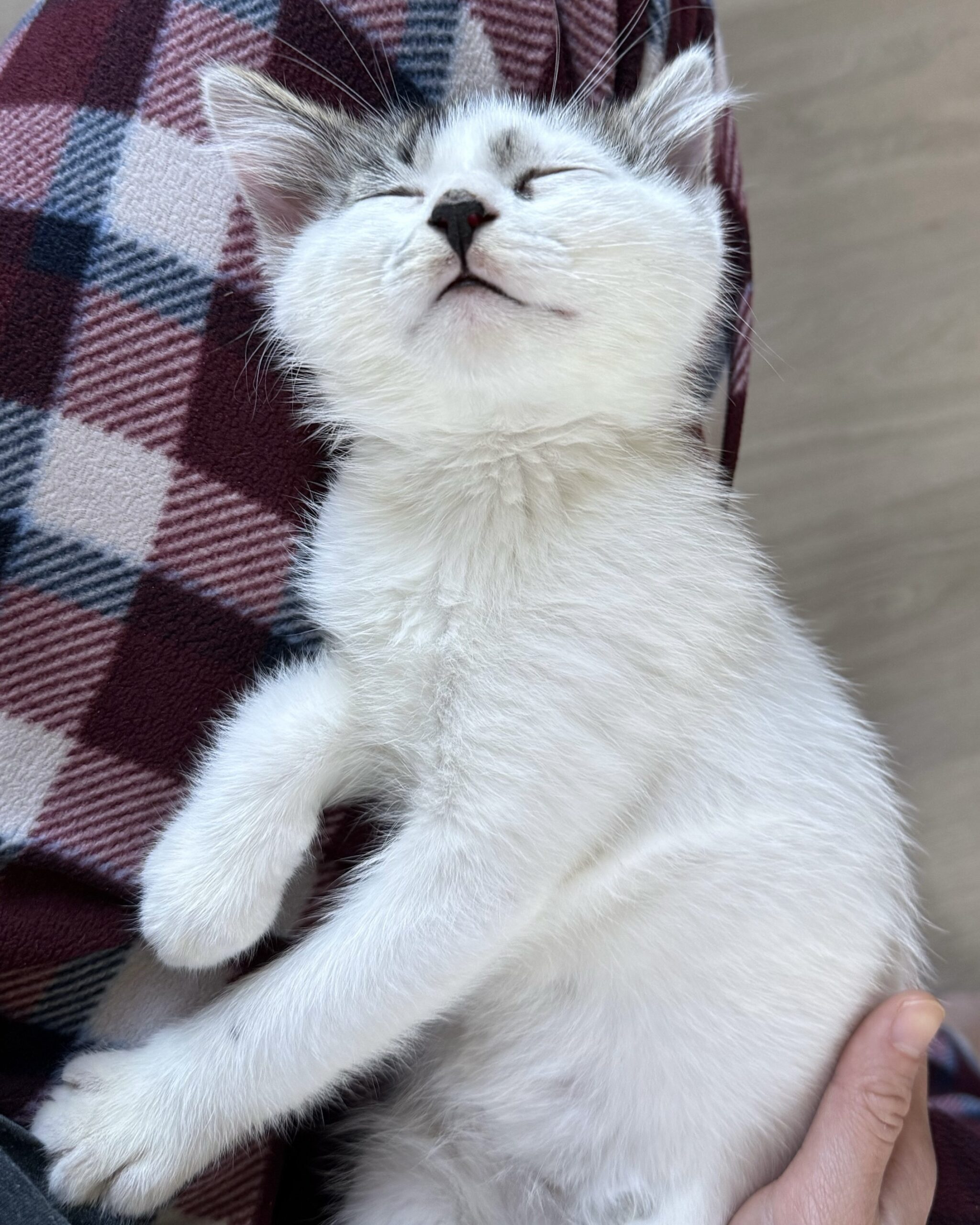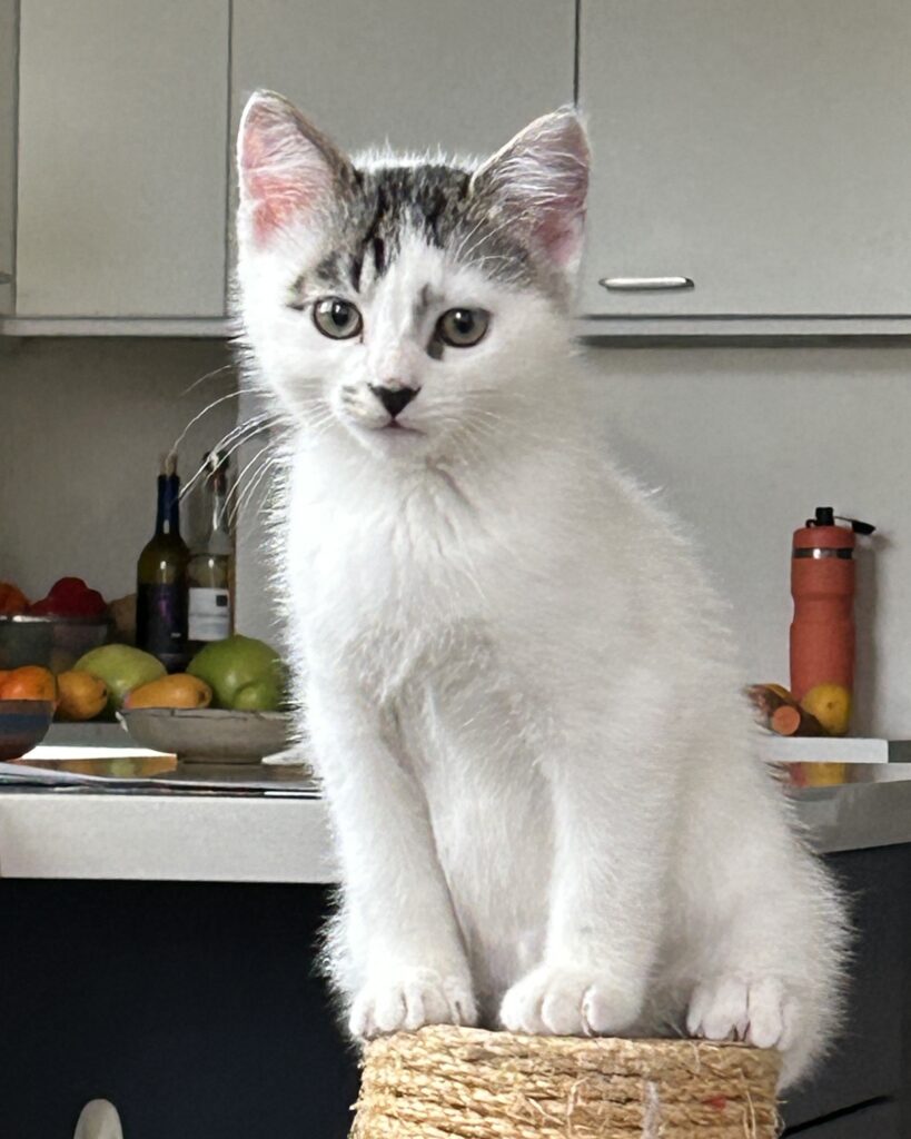 Sesame is a soft-spoken boy, very sweet and affectionate. He hasn’t figured out meowing yet, and usually ends up chirping or squeaking for attention instead. When you pet him, he’ll wiggle his tail happily and purr quietly. He loves cuddling up under your chin for a nap. He’s also a responsible big brother and will care for his little brothers (and his human!) by gently grooming them.