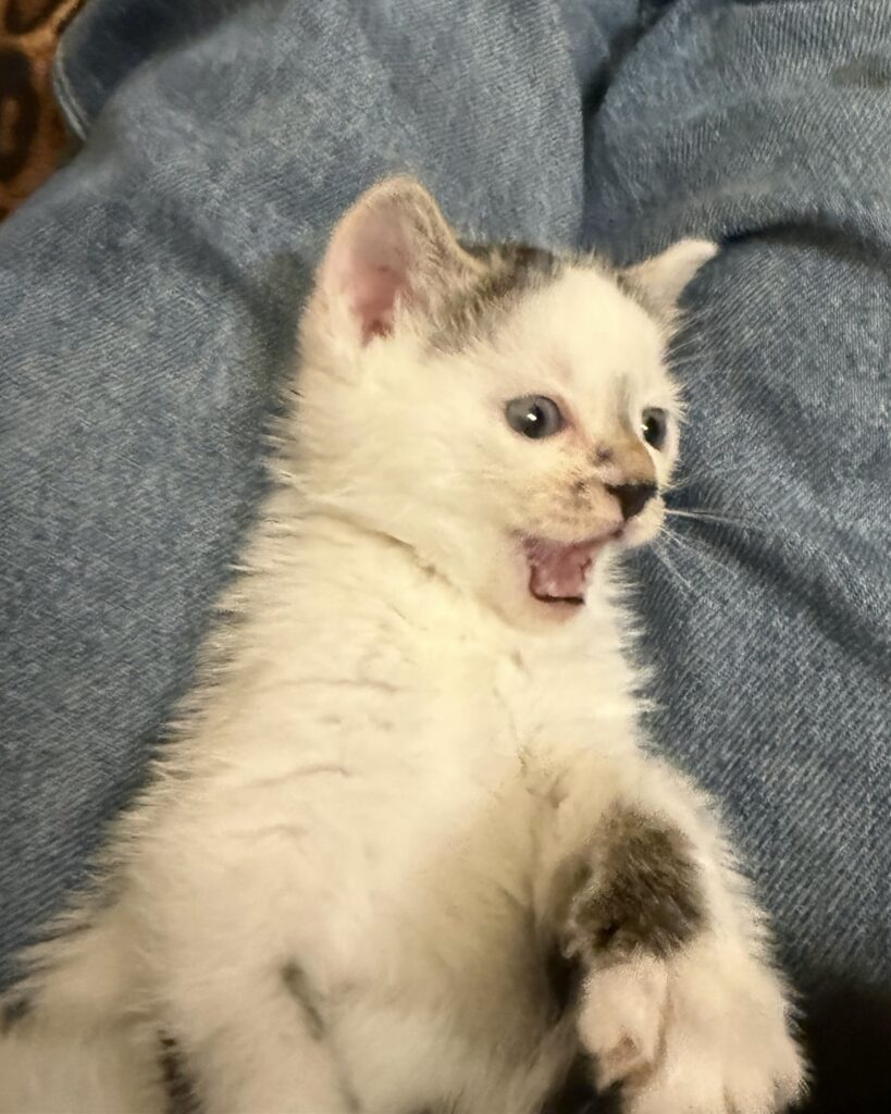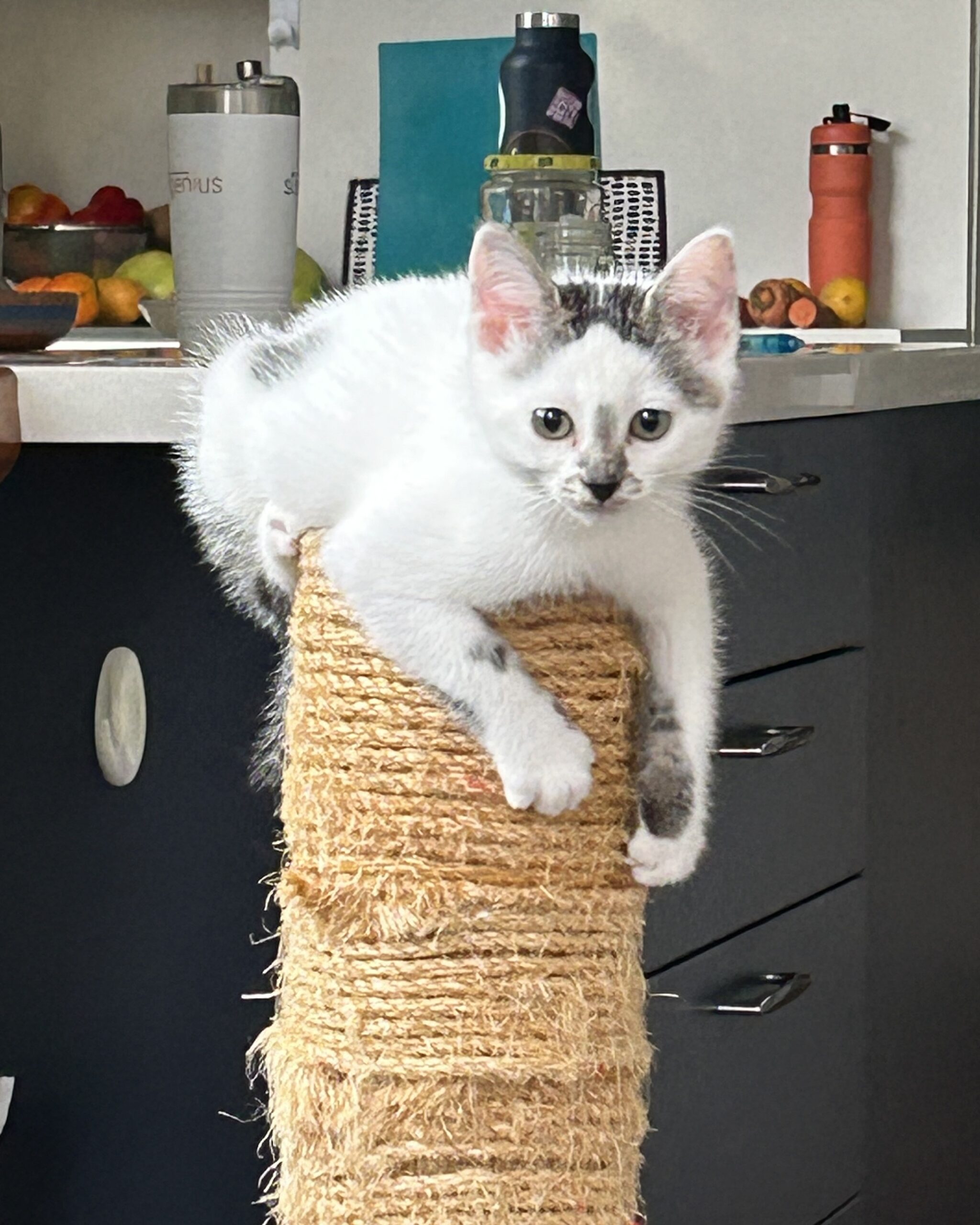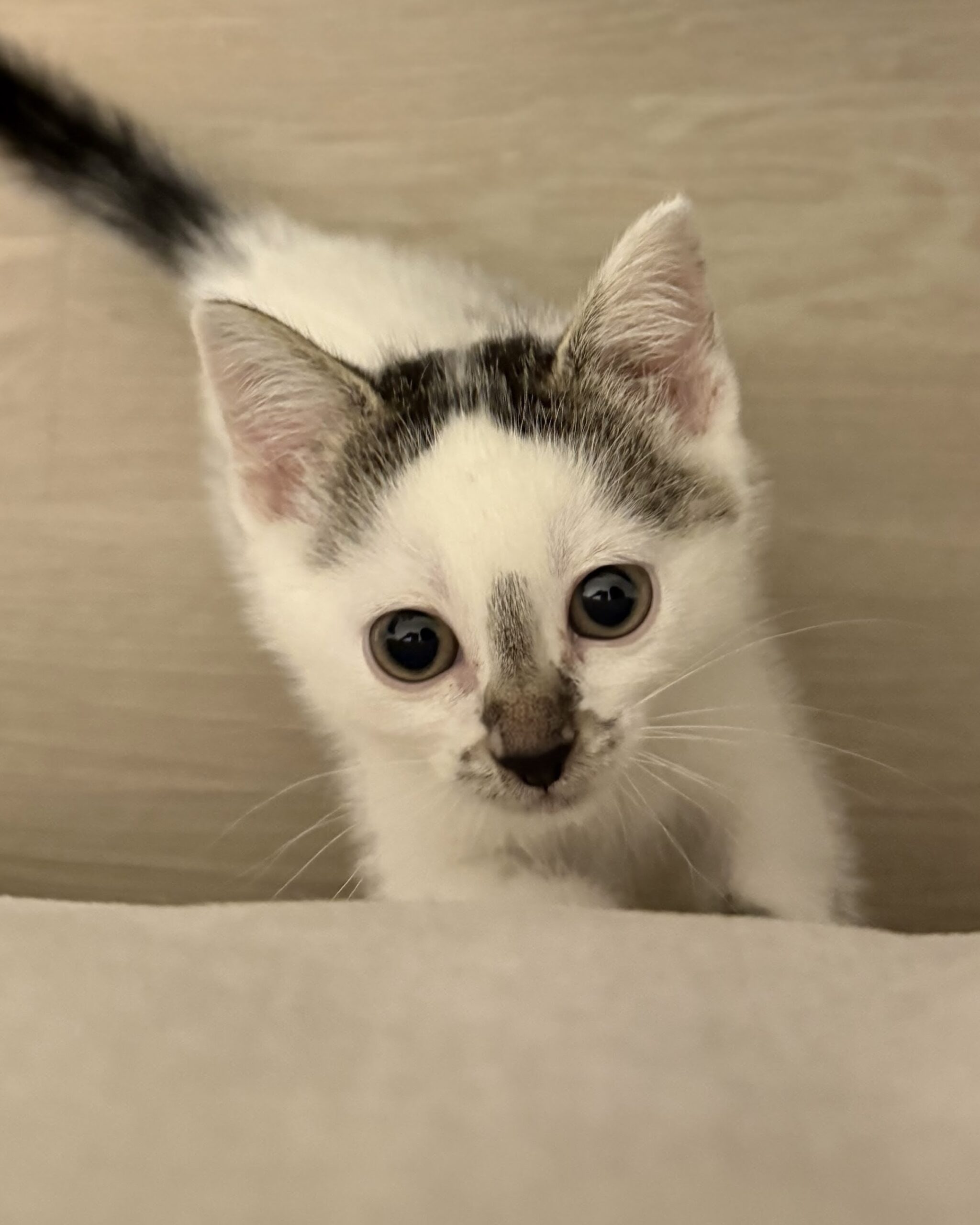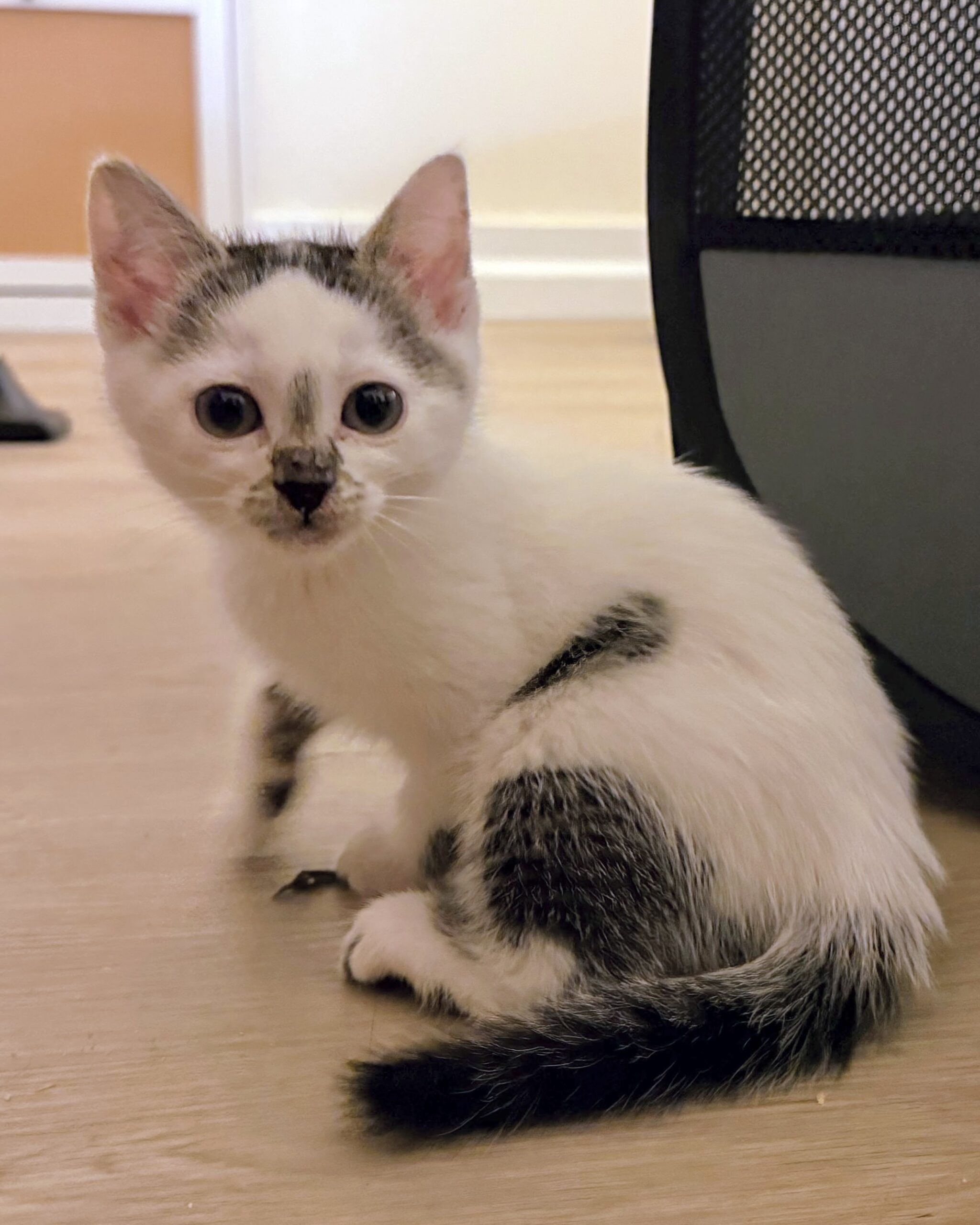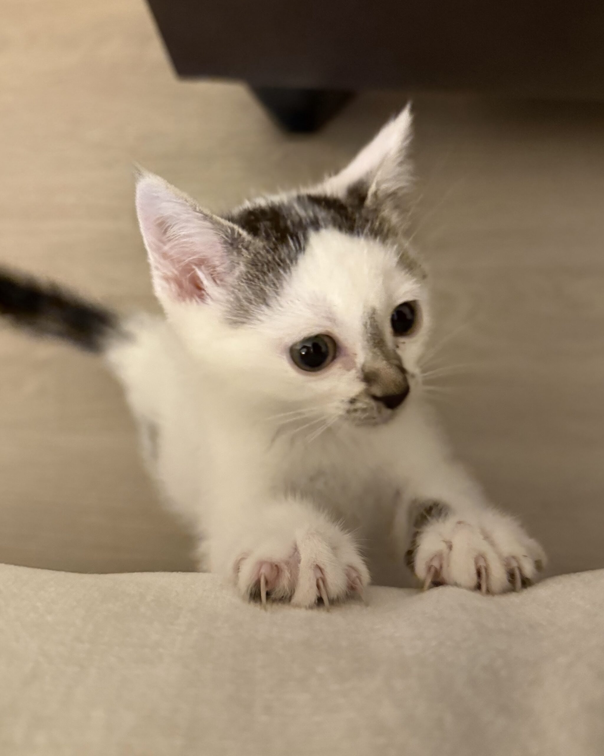 Tofu is the tiniest of his brothers and the ultimate velcro cat. While his brothers wrestle during play time, Tofu would rather meow at your feet to be picked up. He loves wiggling his way up to your shoulder and gently sniffing your face, purring loudly the whole time.