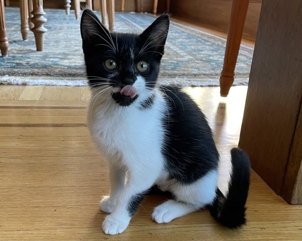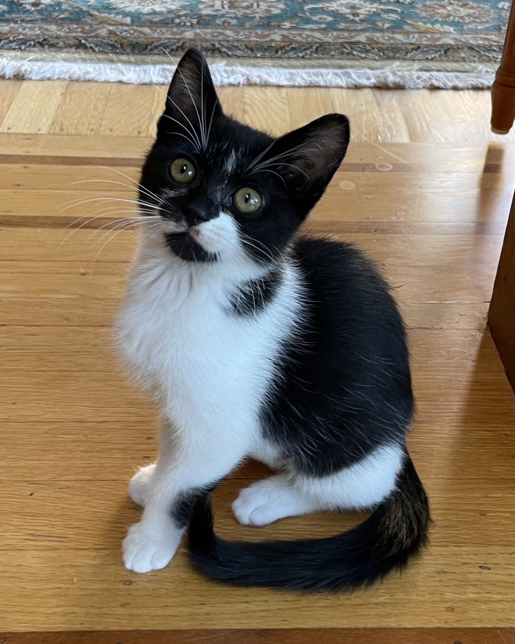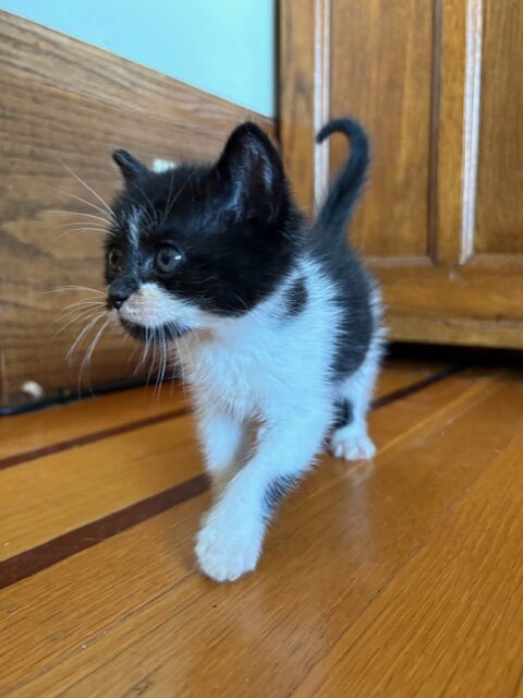 Fuji is three months old; a girl kitten with soft black and white fur. She is very sweet and loves playing with toys and anything that moves like a leaf or paper ball. Playing chase is one of her favorite games!