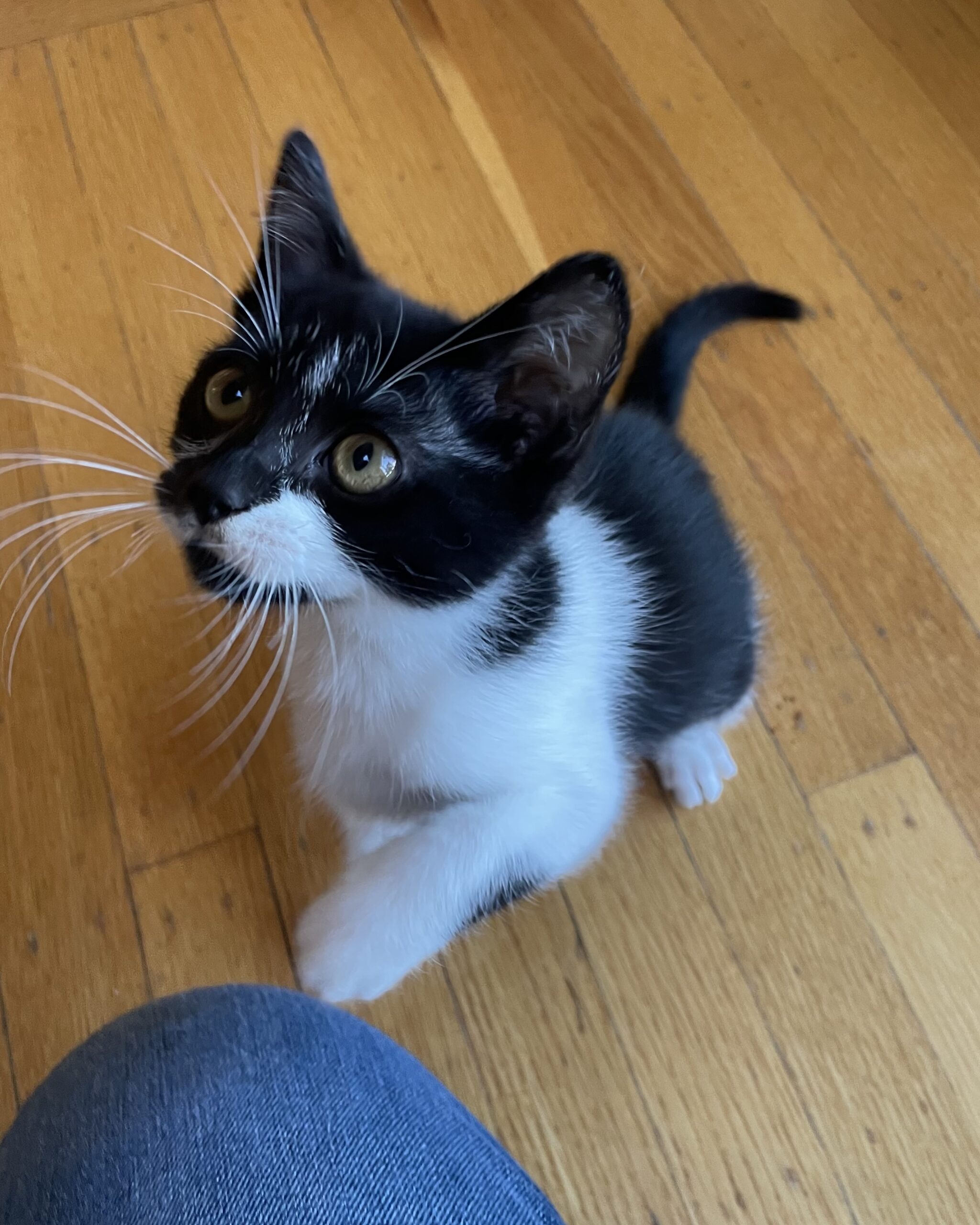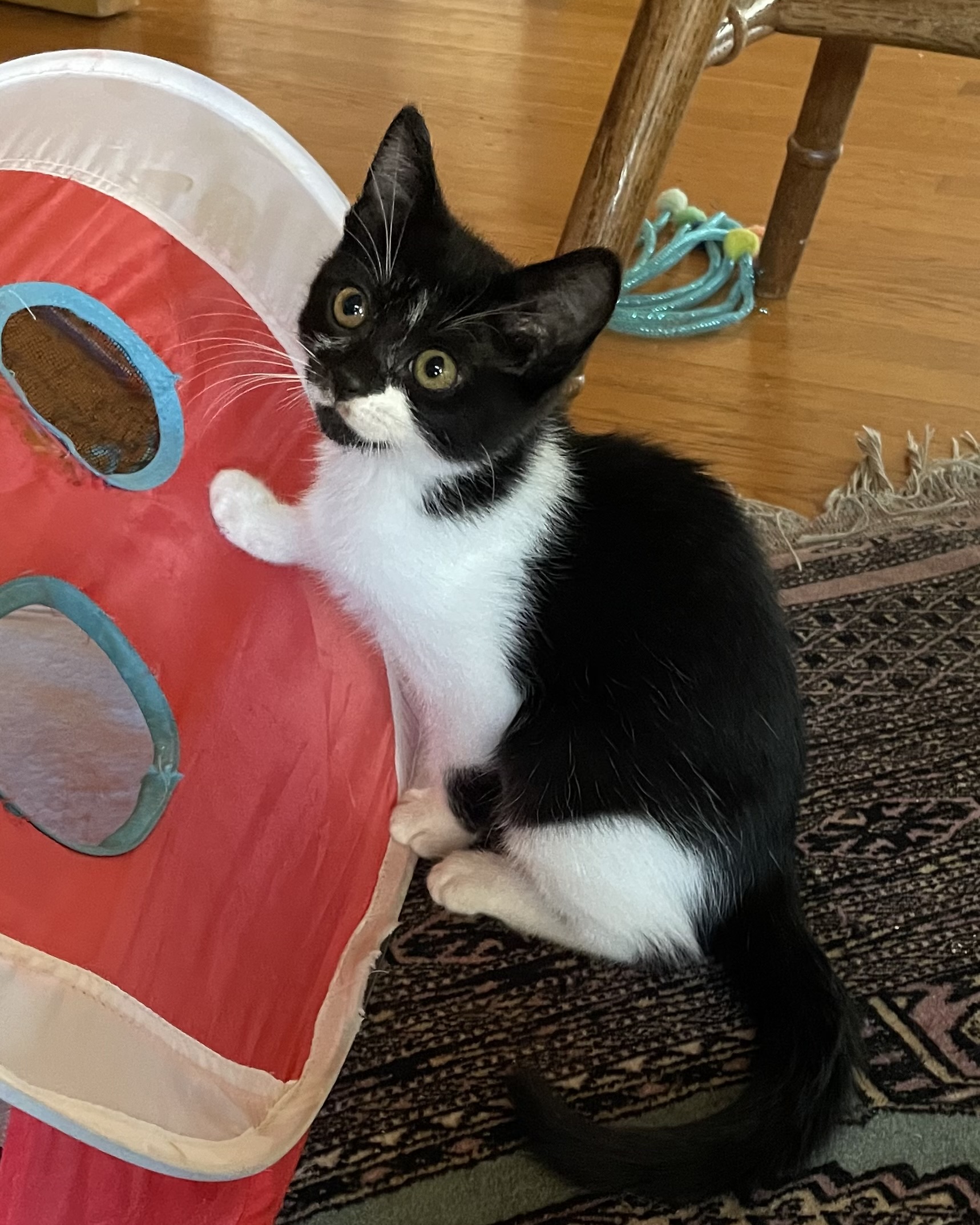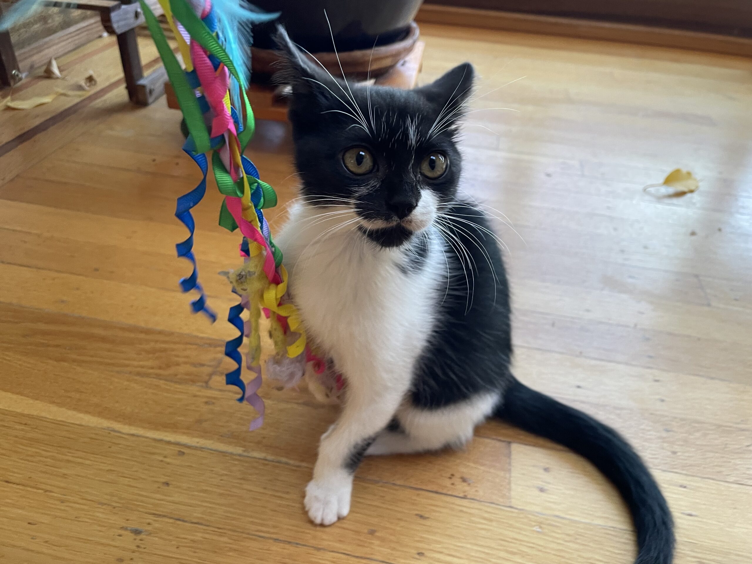 Fuji is three months old; a girl kitten with soft black and white fur. She is very sweet and loves playing with toys and anything that moves like a leaf or paper ball. Playing chase is one of her favorite games!