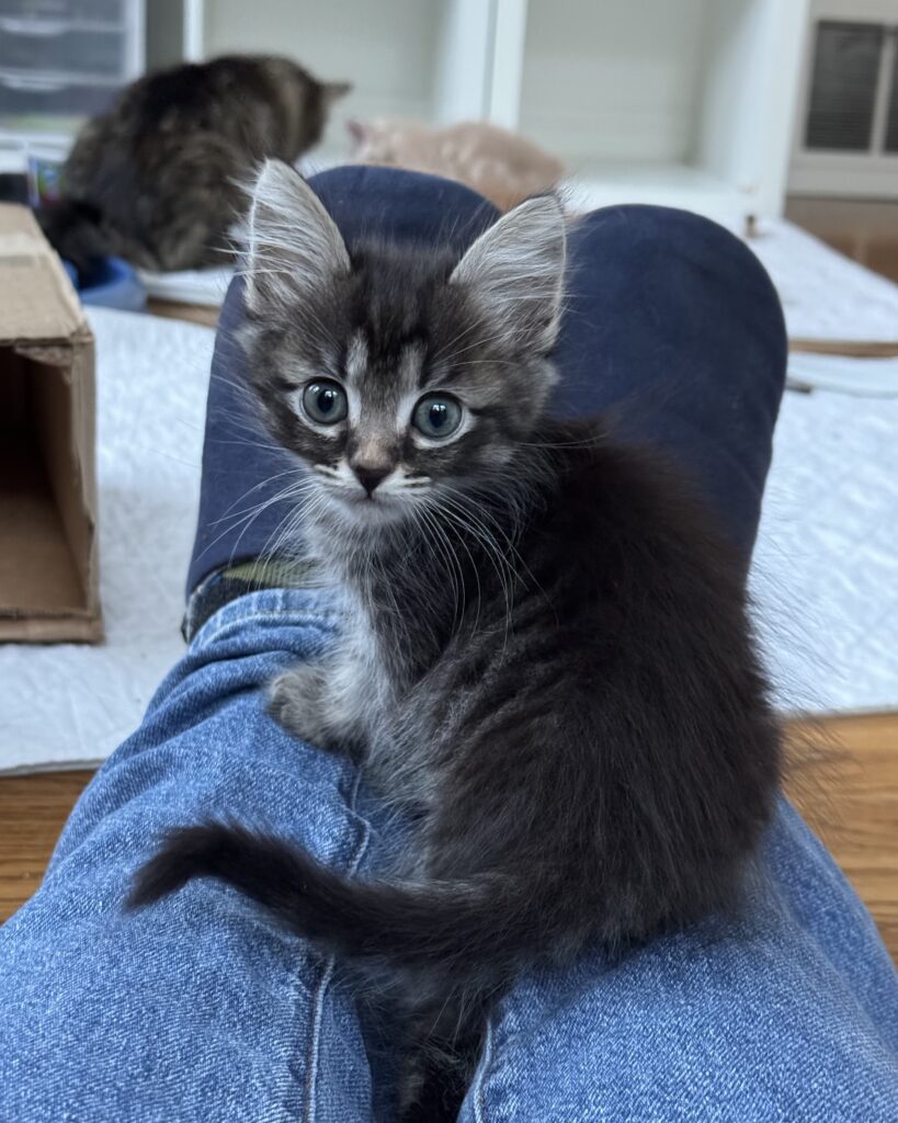 Loki has long dark grey and black tabby fur and big ear tufts that he hasn’t quite grown into. His fur is silky soft like his mother’s (who also has long fur). Loki is looking for people to call his own and laps to snuggle into.