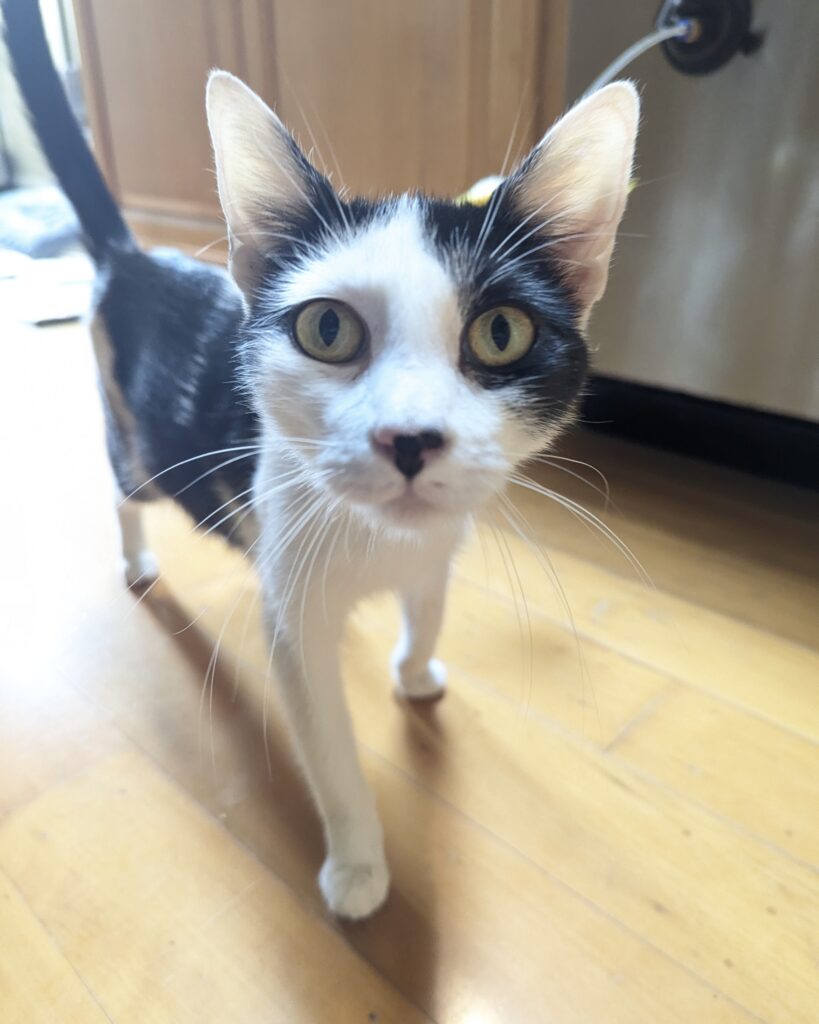 Once you break through her initial skepticism, she’s an absolute lover girl: purring so loud it’s almost as if she’s purring in two octaves at once; leaning up against your leg when you’re sitting down; and, if she doesn’t feel like you’re petting her enough for her liking, even grabbing your hand in her paw and smushing her little face all over you until you get the hint.
