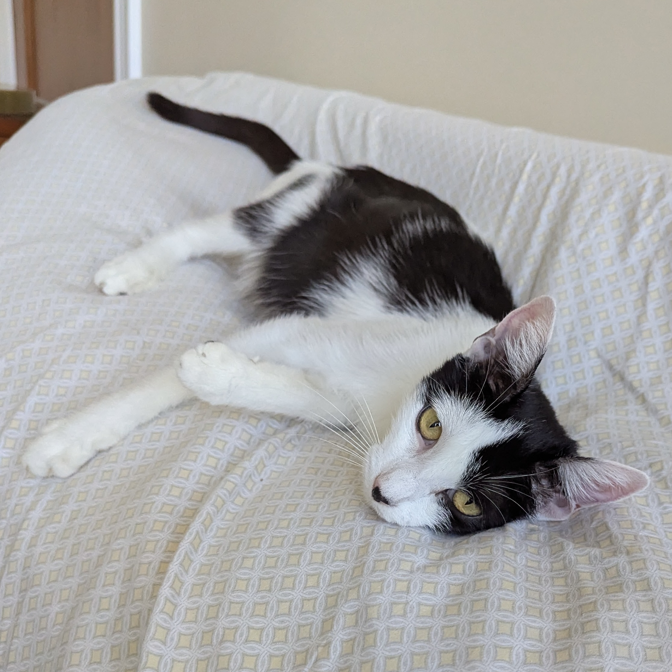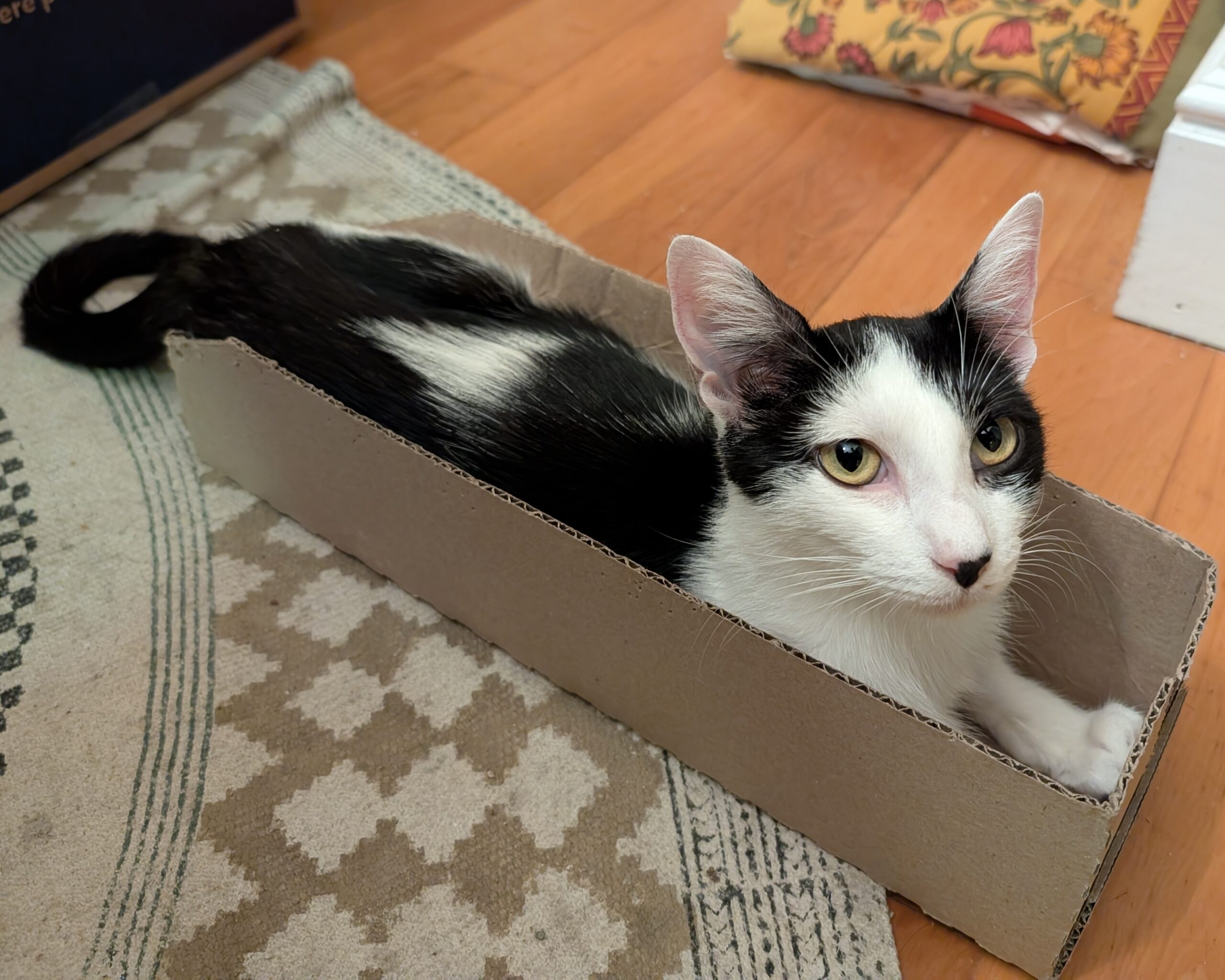 Once you break through her initial skepticism, she’s an absolute lover girl: purring so loud it’s almost as if she’s purring in two octaves at once; leaning up against your leg when you’re sitting down; and, if she doesn’t feel like you’re petting her enough for her liking, even grabbing your hand in her paw and smushing her little face all over you until you get the hint.