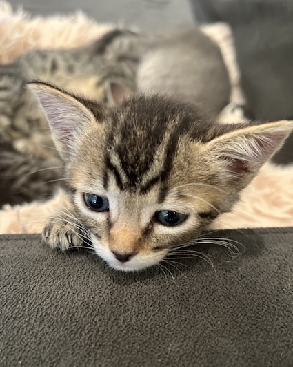 Axel is a super sweet kitten. He’s a brown tabby with so much love to give! He’s a snuggly boy who likes to cuddle up in laps. He also has a playful side, and enjoys wrestling matches and games of chase with his sister and best friend Sue Sue.