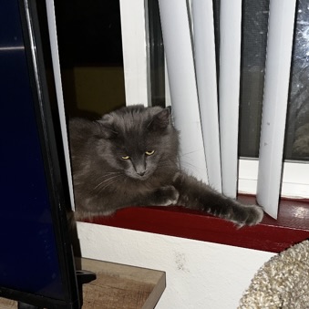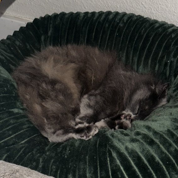This girl is very food motivated (treats are the way to her heart!) but shows no food aggression toward people or other cats. She’s also quite social and enjoys being part of the action—even if she’s still learning her place in the household.