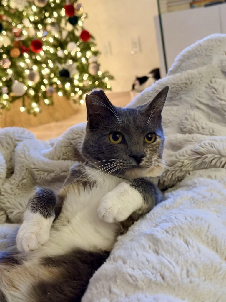 Nala is a gentle, cuddly girl who loves to lounge, stretch out like a little model, and show off her belly (hint: that’s your cue for rubs). She’s mellow for her age, affectionate, and has the cutest habit of asking for more attention when she feels you paused too early.