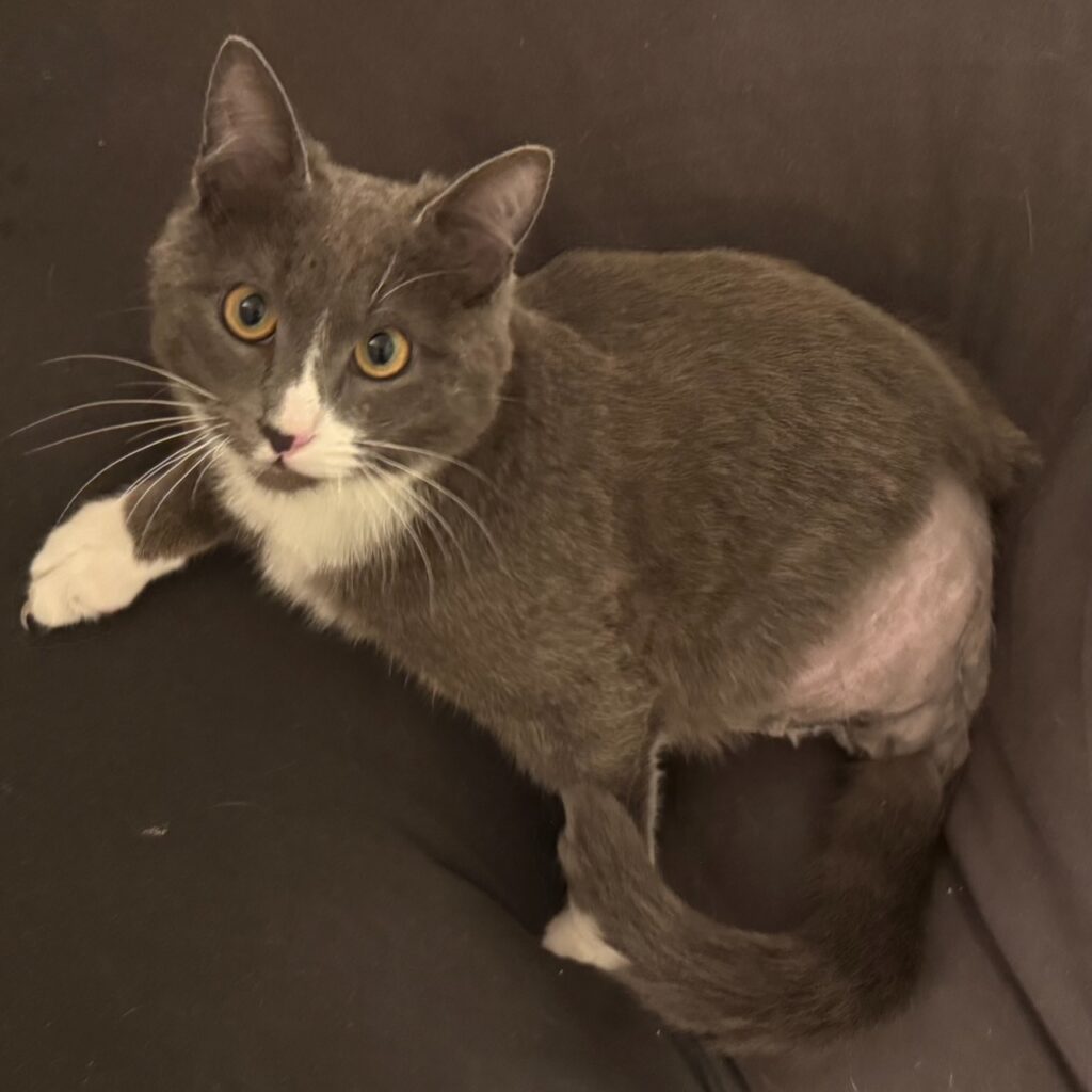 Minou, a handsome gray tuxedo with kind yellow eyes, showed up in a garage earlier this year. A good samaritan took him in, and the vet noticed that he had a leg injury – which turned out to be a broken hind leg that had healed incorrectly. Minou’s leg was amputated, and as Minou healed, his foster realized that he’s a VERY friendly cat who loves treats, toys, and laps.
