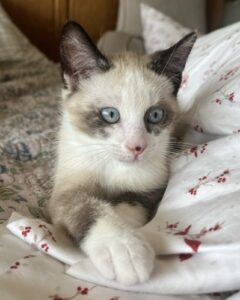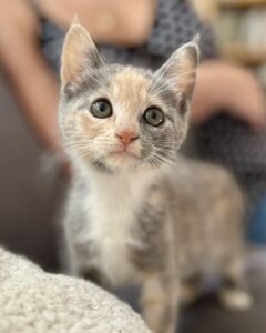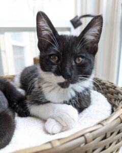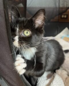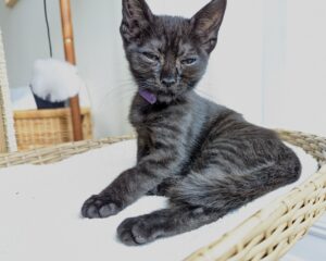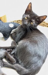 Wombat is the ultimate lap cat – a steadfast cuddle companion who loves nothing more than curling up into a tight ball and snoozing in your lap. This beautiful black tabby (with striking visible stripes!) will greet you with eager purrs, leg rubs, and a heart full of affection. Don’t be fooled by his chill…
