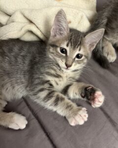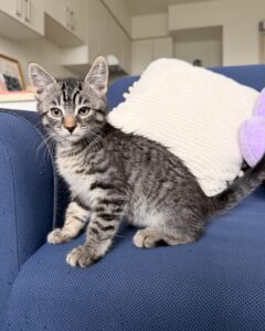 Shrimp is a little gray tabby with a great balance of calm and playfulness. She has reddish-brown tones in her fur, especially around the face. She will quietly call out to be picked up and loved on. While she has a more laid back personality than her siblings, she isn’t afraid to jump in and…