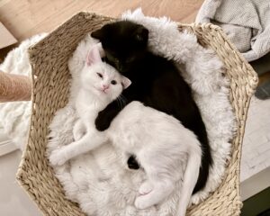 Oreo and Frosting are a sweet, bonded pair who do everything together – playing, napping, and even eating side by side. Frosting, with her pretty white coat and pale grey spots, is the outgoing one, always ready to chat, explore, and be part of whatever you’re doing.