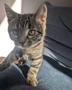 Krill is a little grey tabby girl with white mittens. She can get comfy anywhere, and curl right up to take a nap. Krill enjoys wrestling with her siblings, although she is one of the smallest of her siblings. While she used to be a little shy, her confidence has started to shine over the…