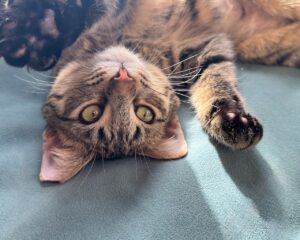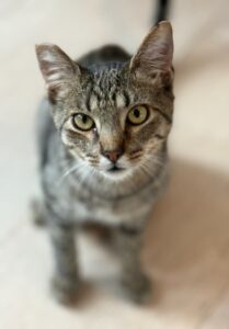 Missy is a beautiful, soft-coated tabby girl with a fluffy, rounded tail that’s as plush as the rest of her. She’s the quieter half of this bonded pair – soft-spoken with a gentle little meow and a personality that unfolds beautifully once she feels safe. Missy might take a bit longer than her brother to…